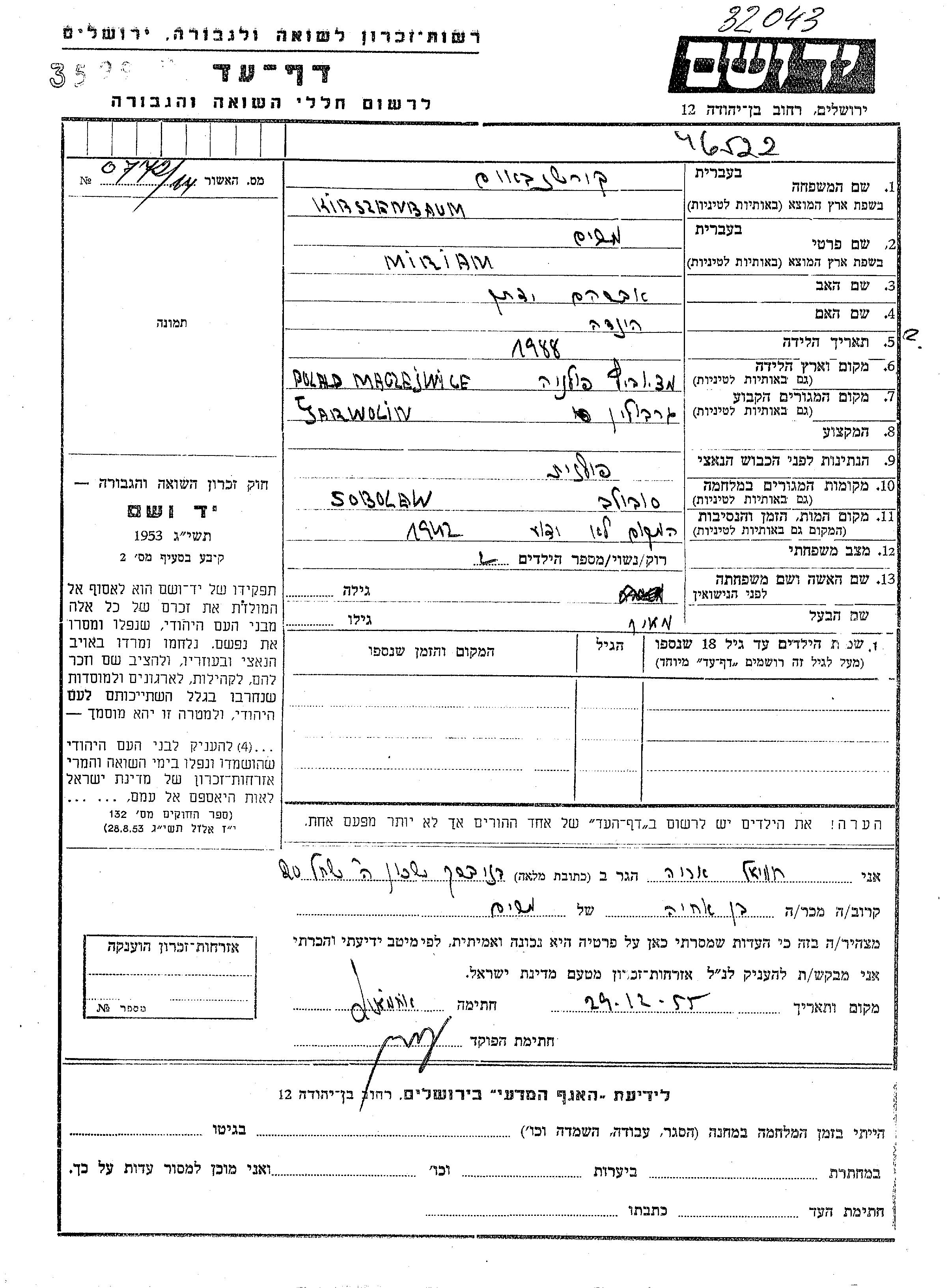 Miriam Kirszenbaum was born in Maciejowice, Poland, 1888 to Avraham Yitzkhak and Hinda. Prior to WWII she lived in Garwolin, Poland. During the war she was in Sobolew, Poland. Miriam was murdered in the Shoah. Place of death: unknown, 1942.