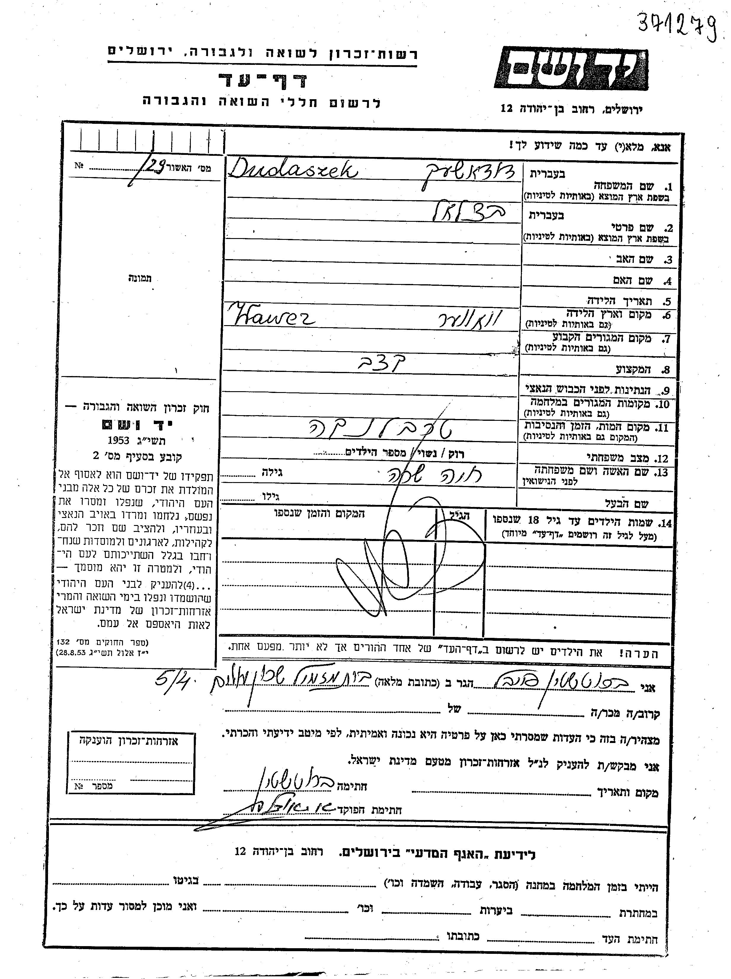 Dudaszek Dudoshek Betzalel unstated place, Page of Testimony