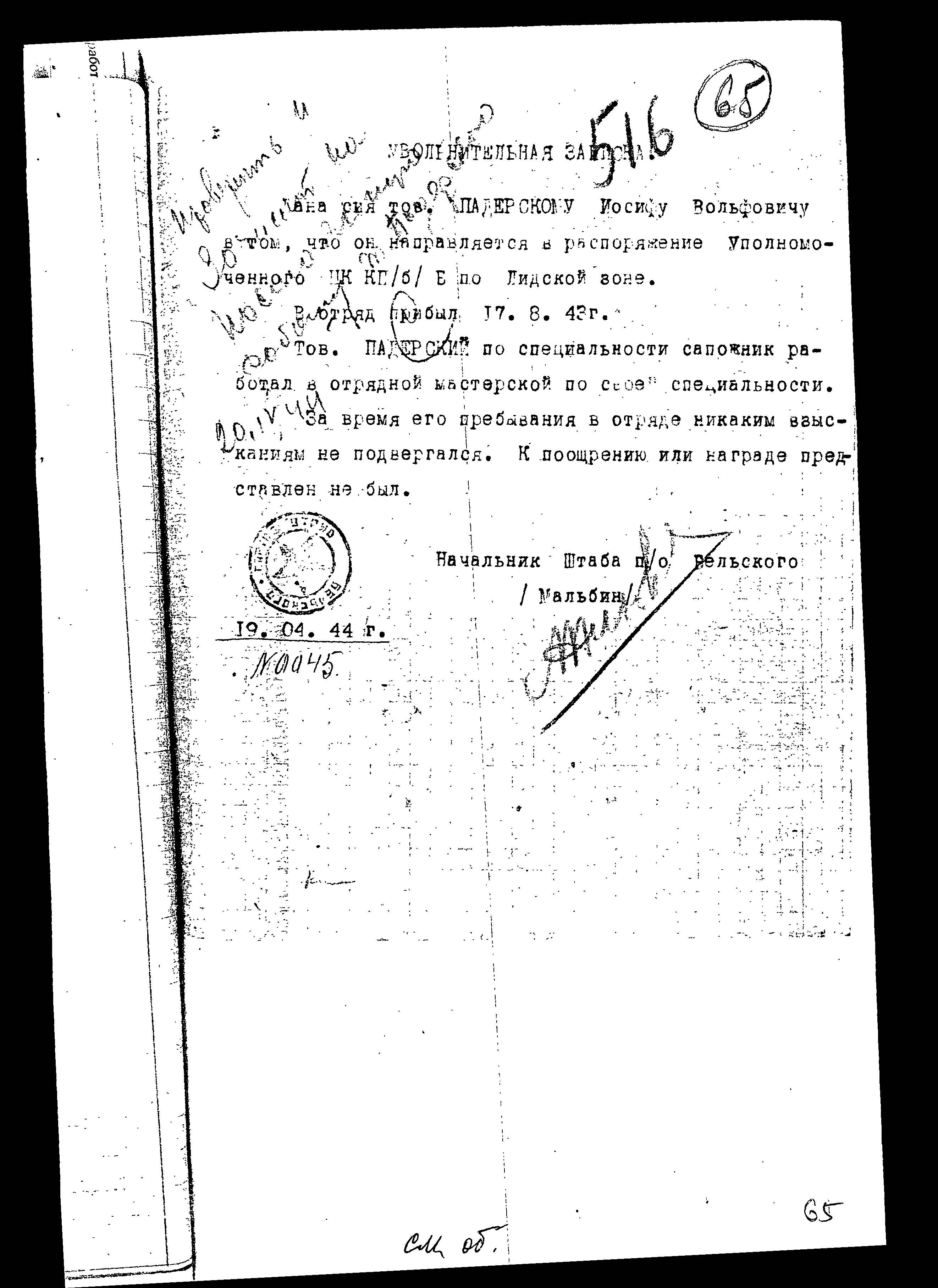 From August 17, 1943 Paderski served in the partisan detachment under the command of Belskiy; at April 19, 1944 he was transfered under the command of Lida zone partisan staff