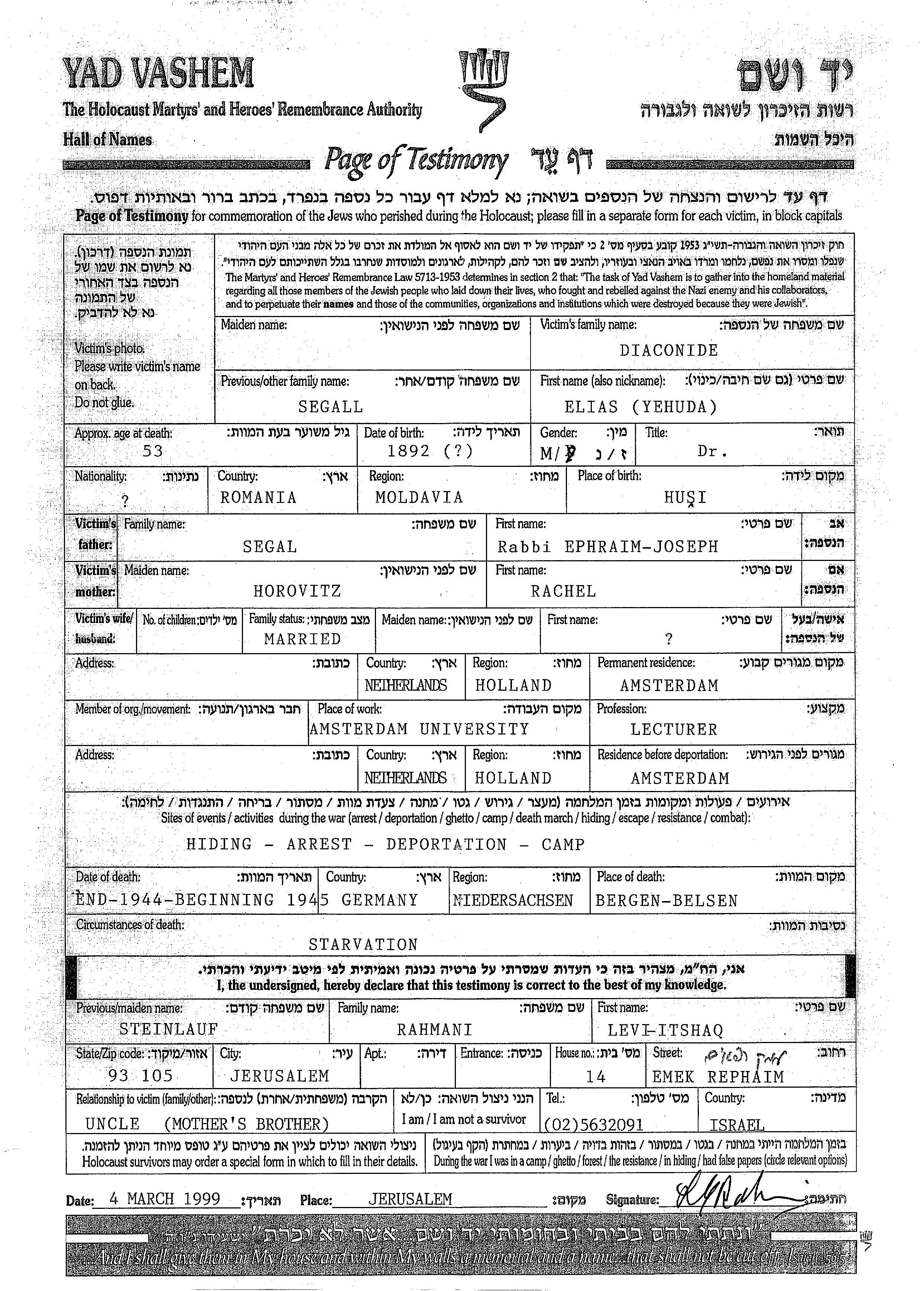 Diaconide Segall Yehuda Elias 1892 Amsterdam, The Netherlands Page of Testimony