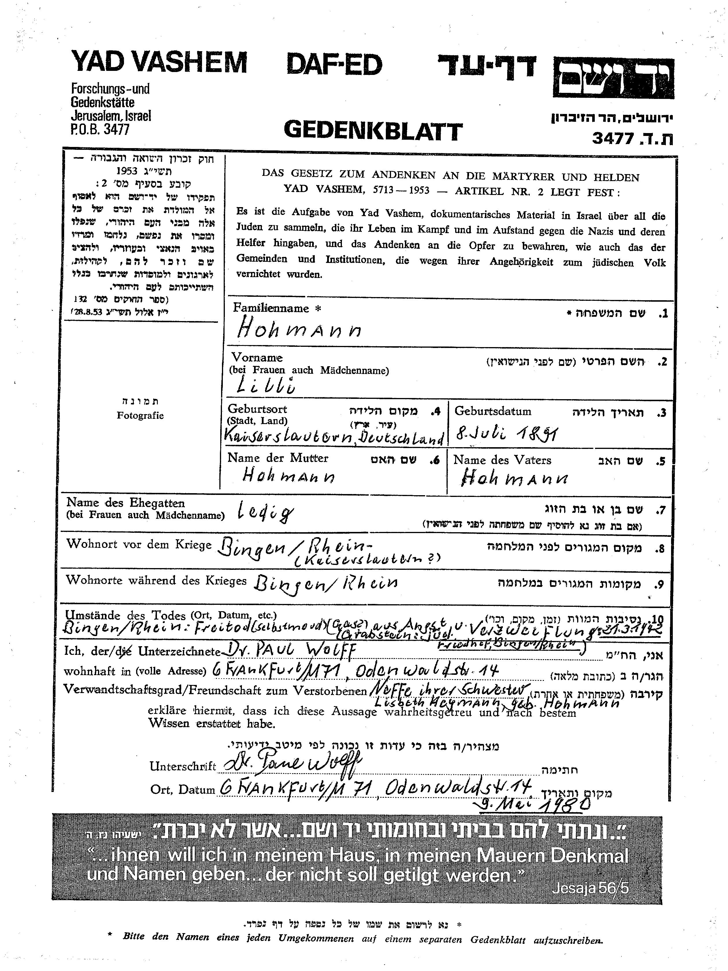 Hohmann Lilli 1891 Bingen, Germany Page of Testimony