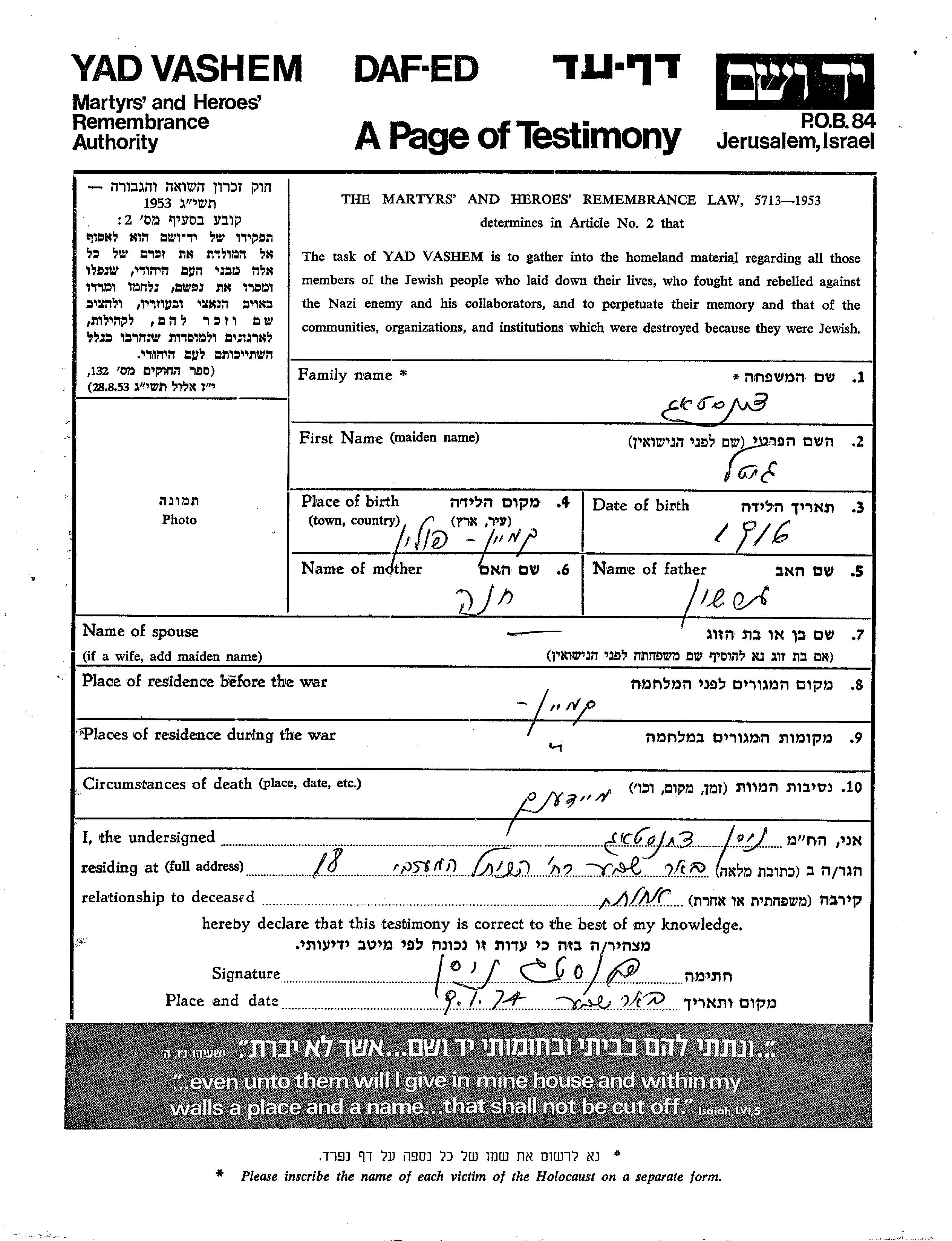 Gitel Dinstag was born in Kamien, Poland, 1916 to Gershon and Khana. Prior to WWII she lived in Kamien, Poland. During the war she was in Kamien, Poland. Gitel was murdered in the Shoah. Place of death: Majdanek, Poland.