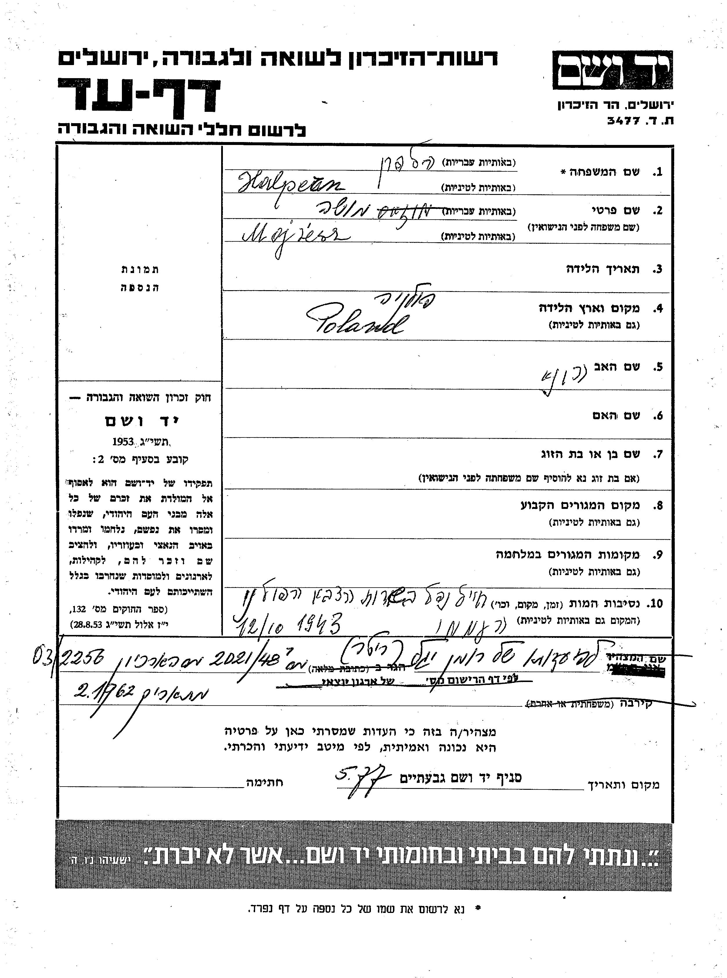 Yad Vashem - Pages of Testimony Names Memorial Collection