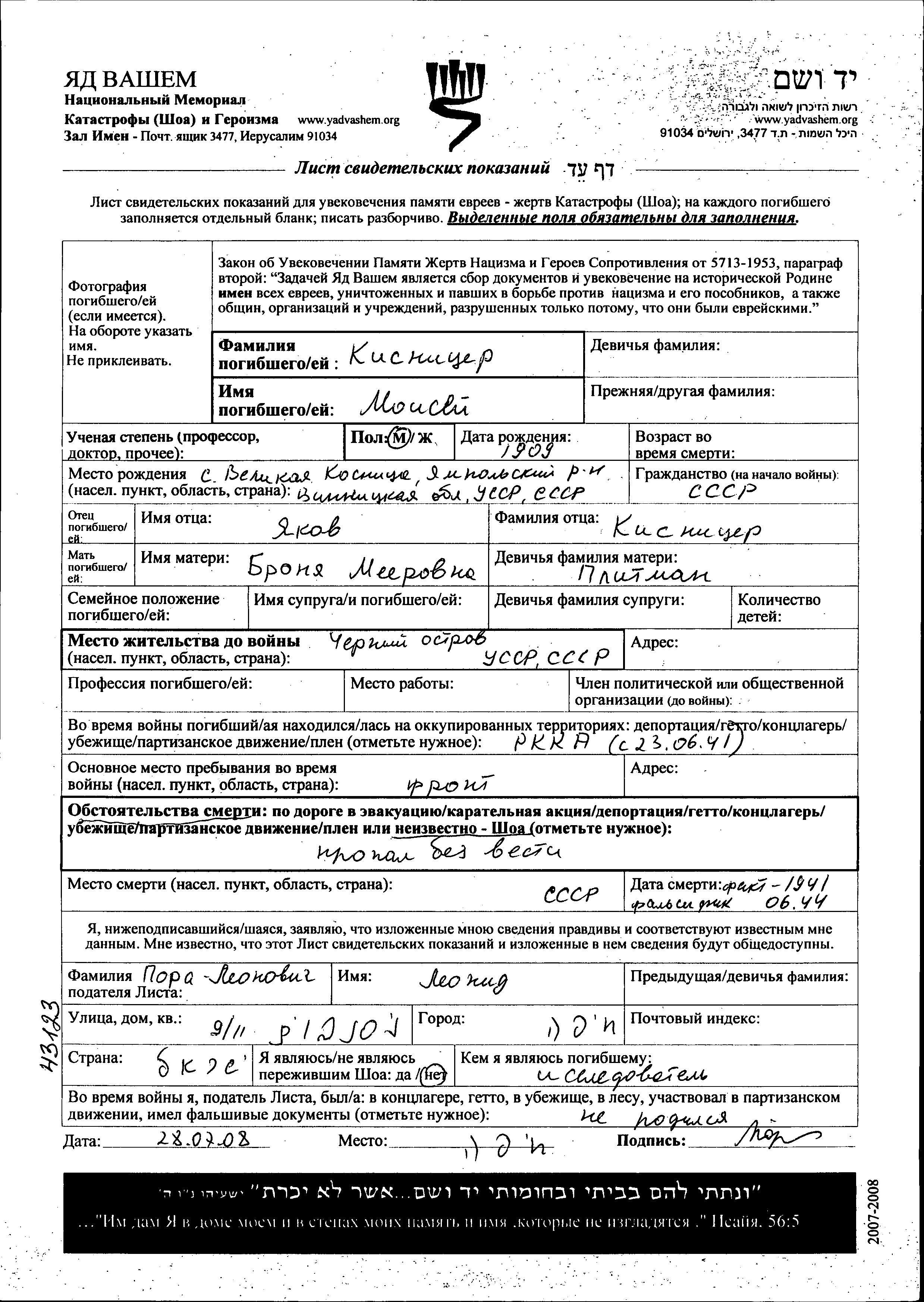 Kisnitzer Moisey 1909 Cherny Ostrov, Ukraine (USSR) Page of Testimony