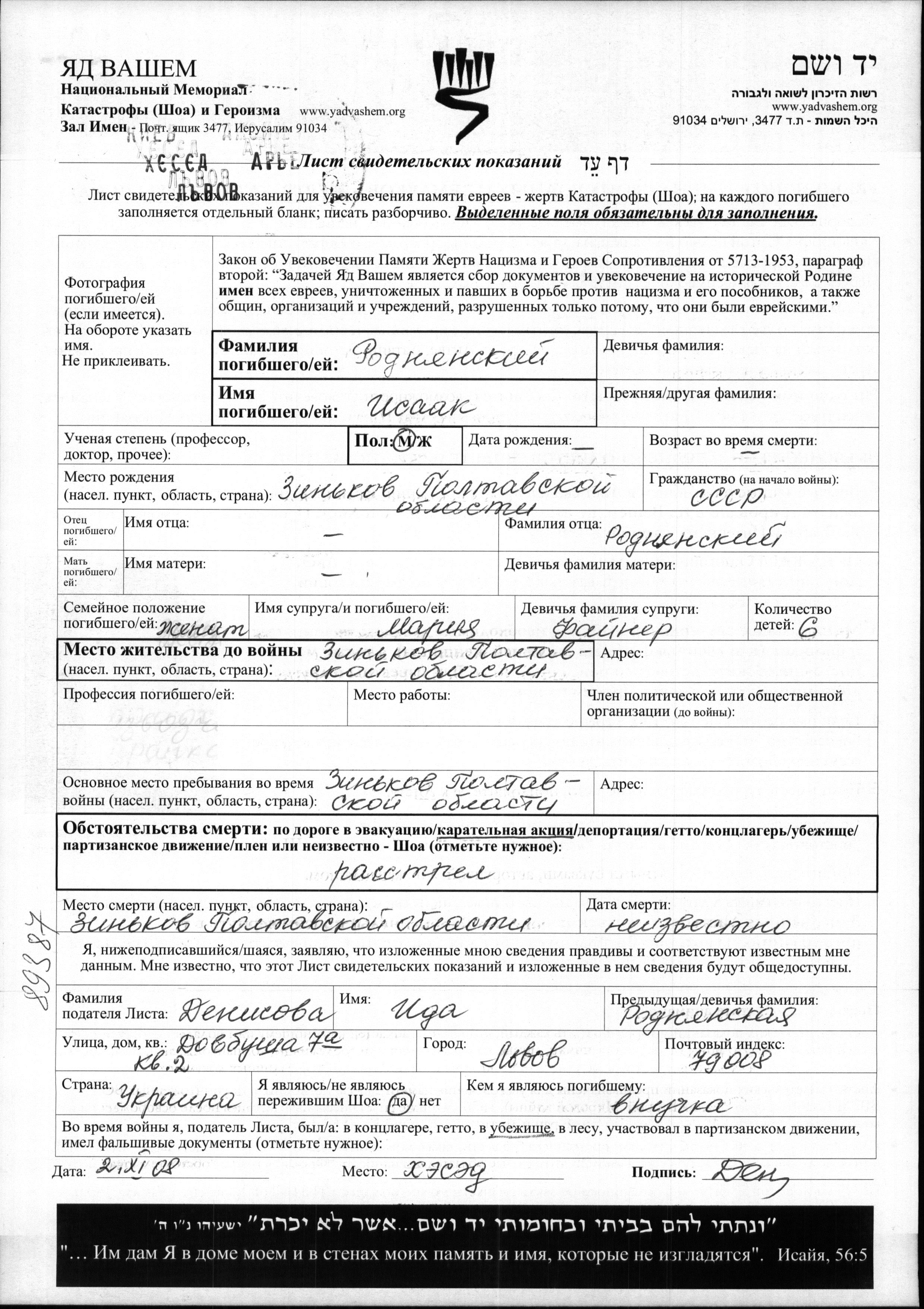 Isaak Rodnyanski was born in Zinkov, Ukraine (USSR). He was married to Mariya nee Fayner. Prior to WWII he lived in Zinkov, Ukraine (USSR). During the war he was in Zinkov, Ukraine (USSR). Isaak was murdered in the Shoah. Place of death: Zinkov, Ukraine (USSR).