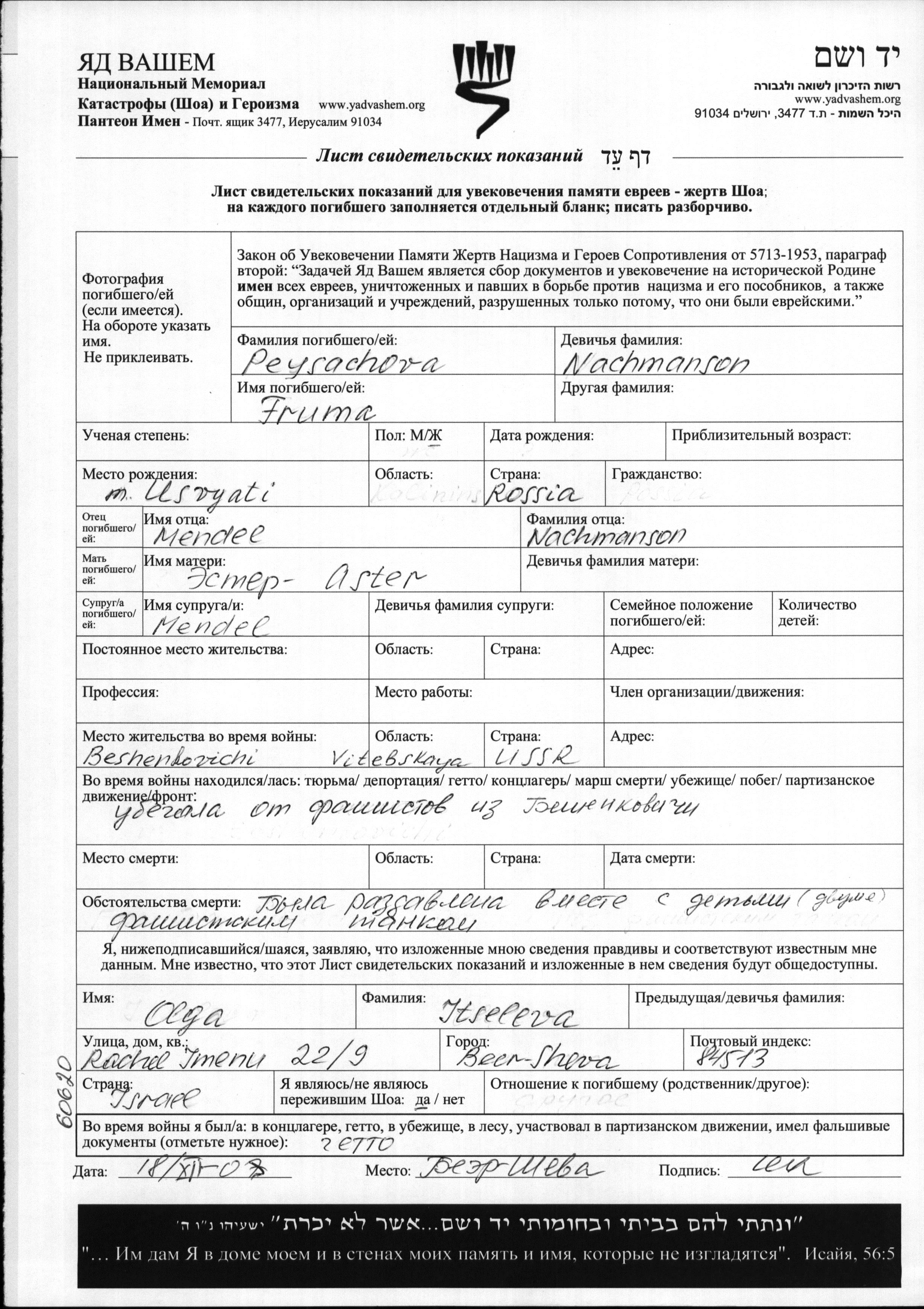 Peysachova Fruma Beshenkovichi, Belorussia (USSR) Page of Testimony