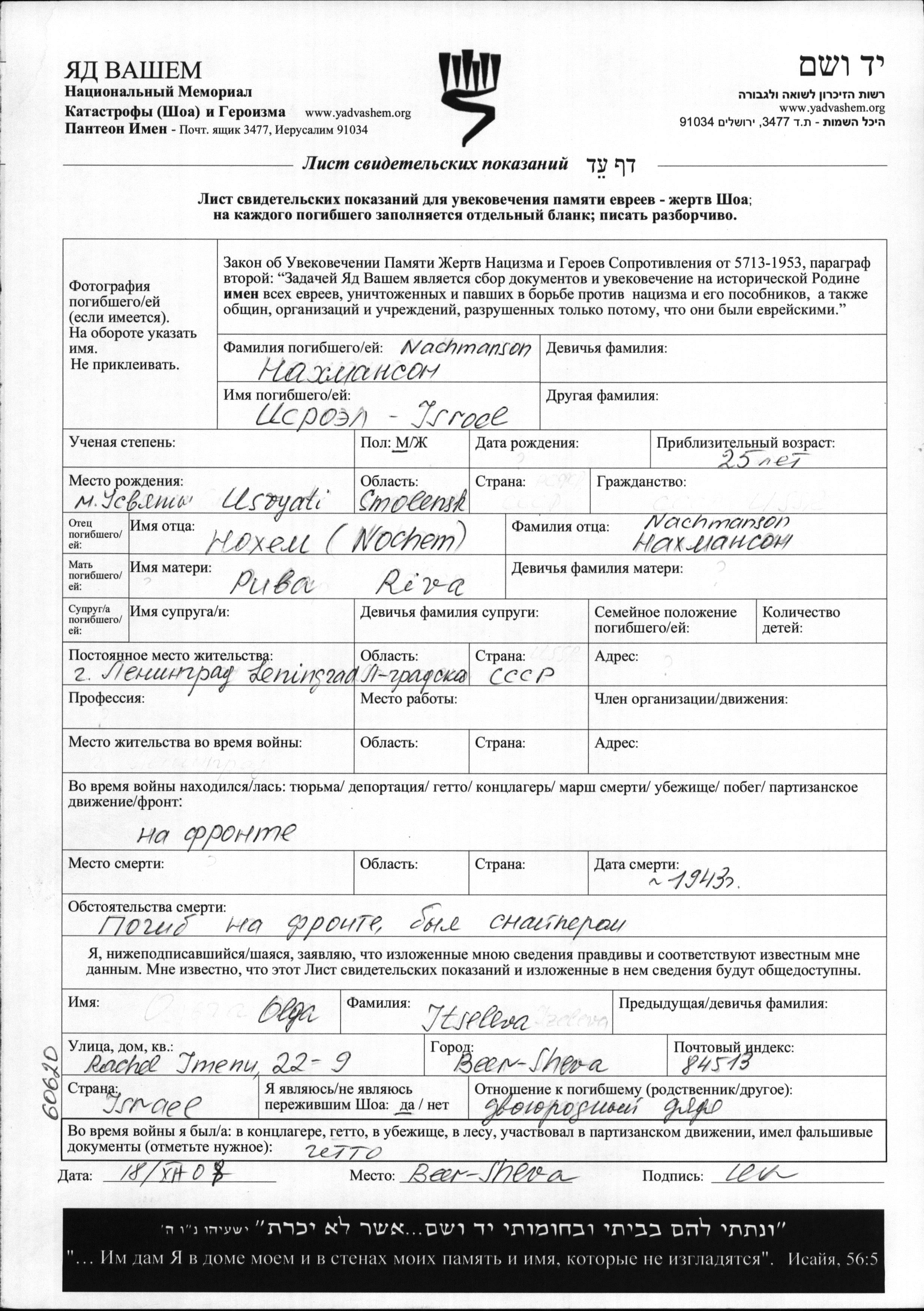 Isroel Nachmanson was born in Usvyaty, Russia (USSR) to Nokhem and Riva. Prior to WWII he lived in Leningrad, Russia (USSR). During the war he was in the Soviet armed forces. Isroel was killed in military service in WWII. Place of death: unknown, 1943.