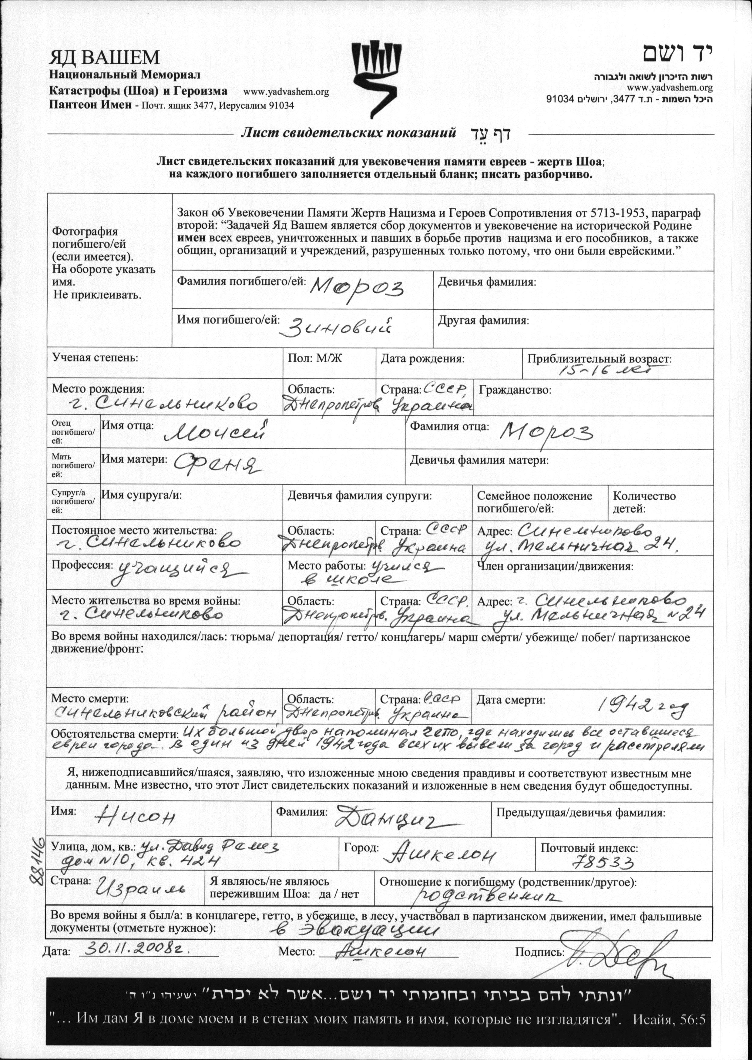 Moroz Zinovi Sinelnikovo, Ukraine (USSR) Page of Testimony