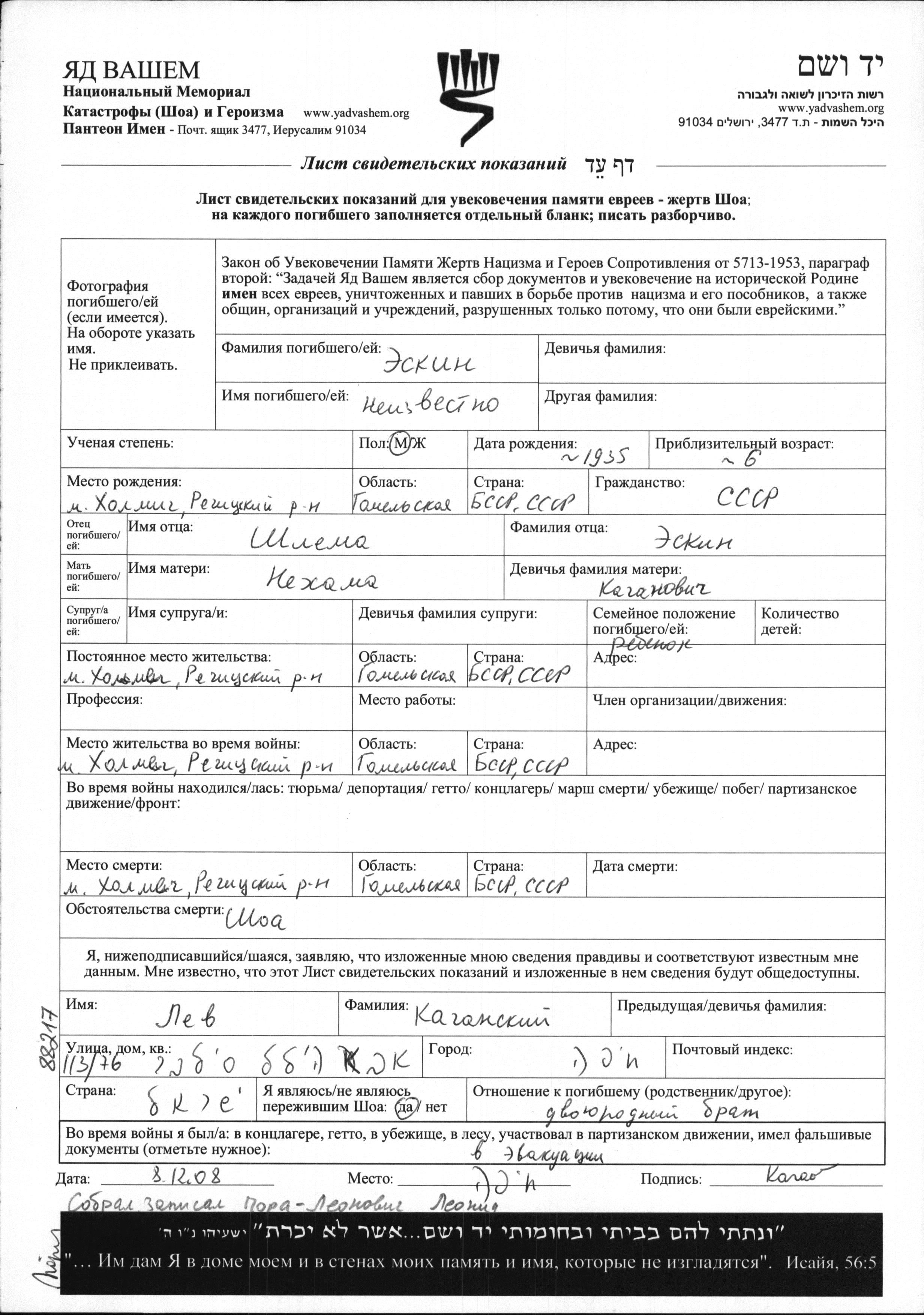 First name unknown Eskin was born in Kholmech, Belorussia (USSR), 1935 to Shlema and Nekhama nee Kaganovich. He was child. Prior to WWII he lived in Kholmech, Belorussia (USSR). During the war he was in Kholmech, Belorussia (USSR). He was murdered in the Shoah. Place of death: Kholmech, Belorussia (USSR).