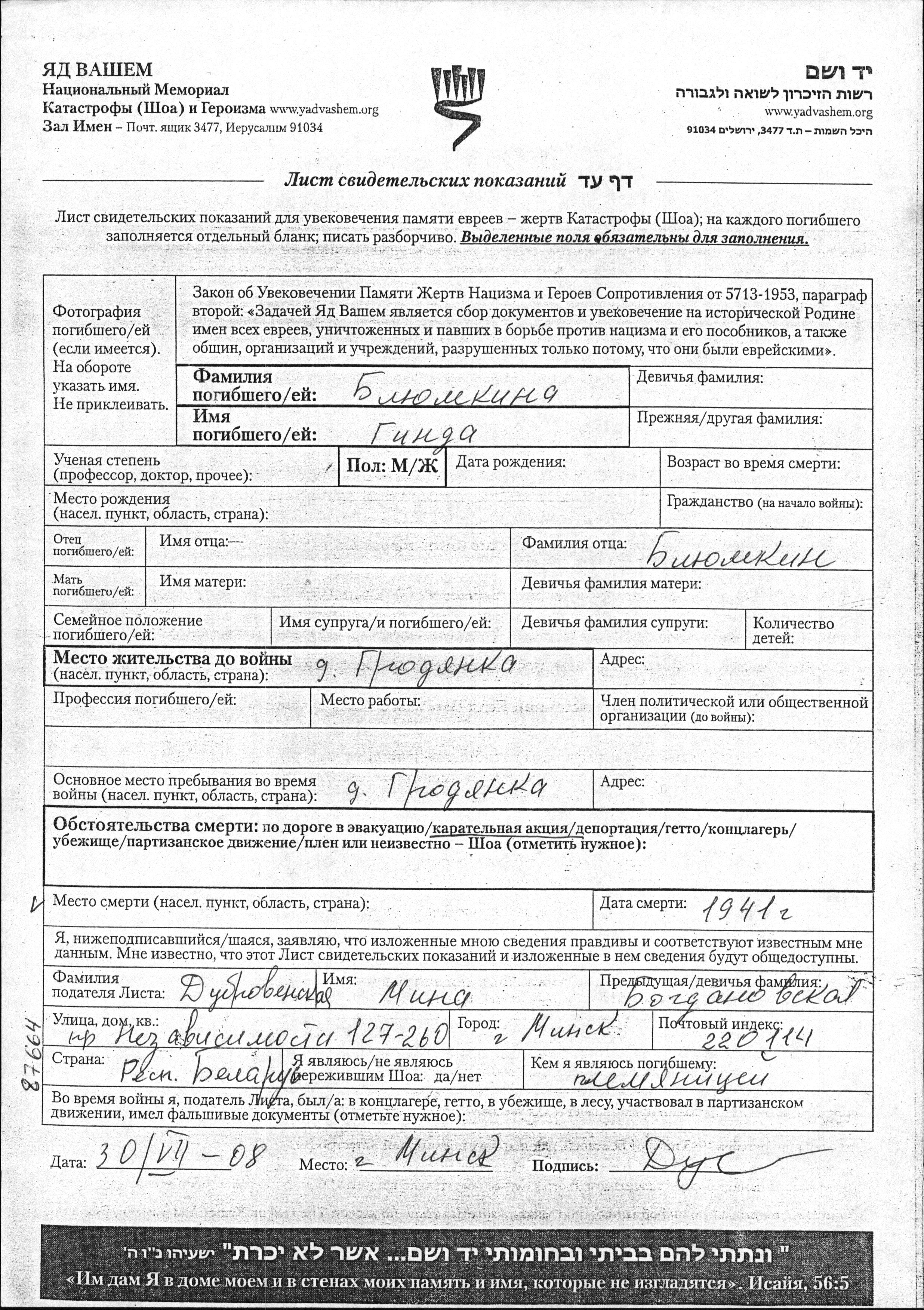 Blyumkina Ginda Grodzyanka, Belorussia (USSR) Page of Testimony
