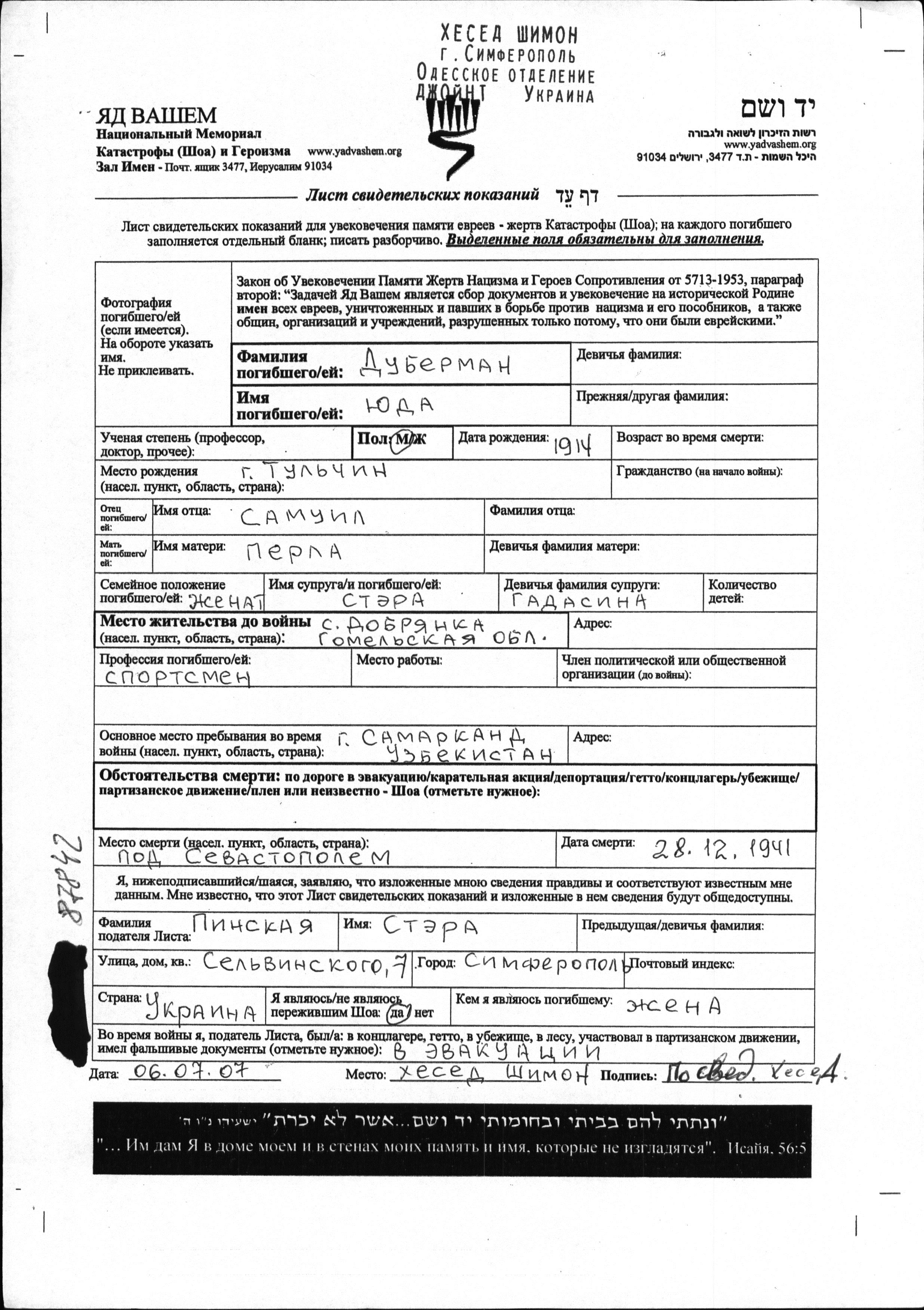 Yuda Duberman was born in Tulchin, Ukraine (USSR), 1914 to Samuil and Perla. He was a sportsman and married to Stera nee Gadasina. Prior to WWII he lived in Dobryanka, Ukraine (USSR). During the war he was in the Soviet armed forces. Yuda was killed in military service in WWII. Place of death: Sevastopol, Russia (USSR), 28/12/1941.
