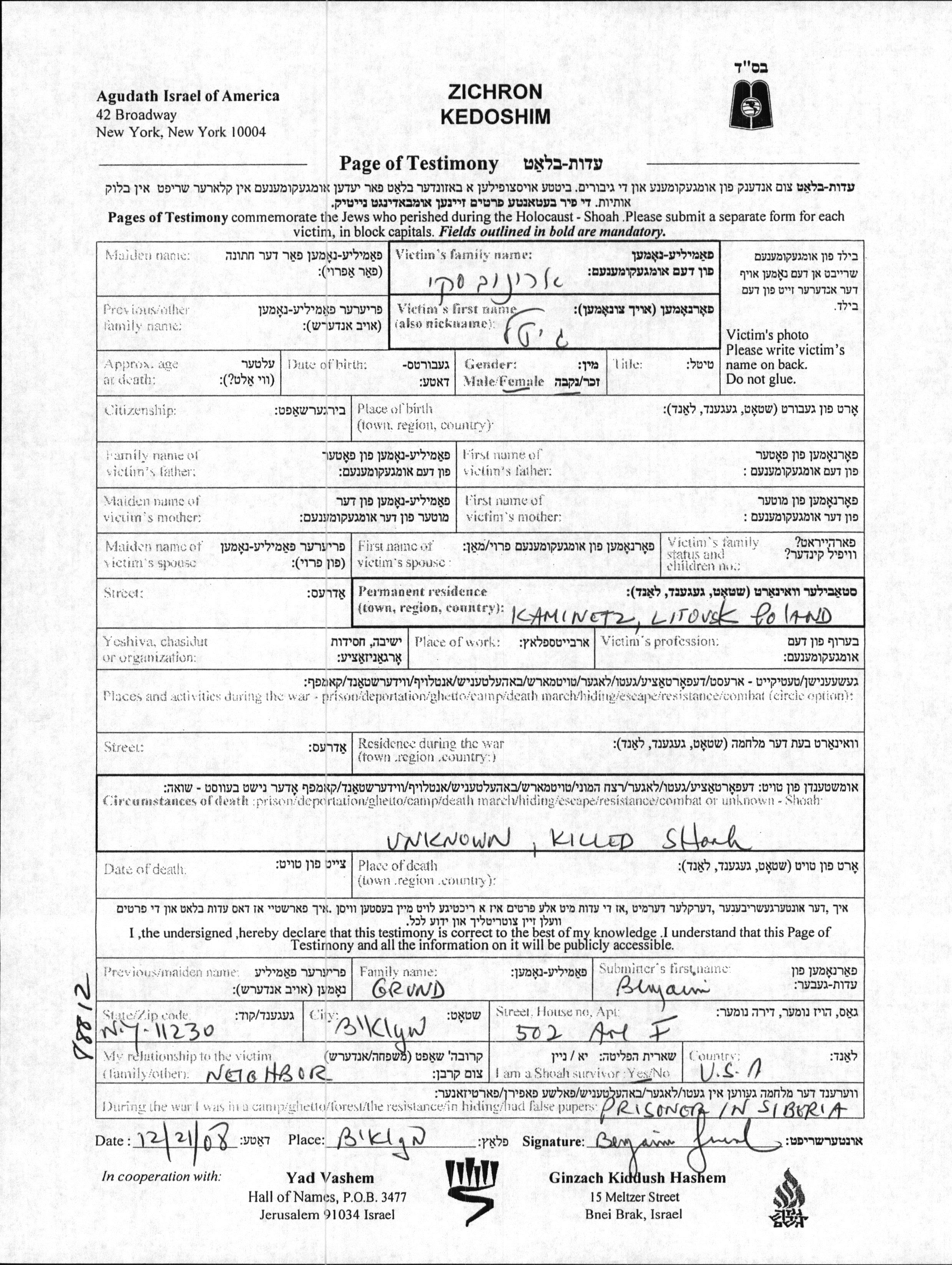 Aronovski Gitel Kamenets Litovsk, Poland Page of Testimony