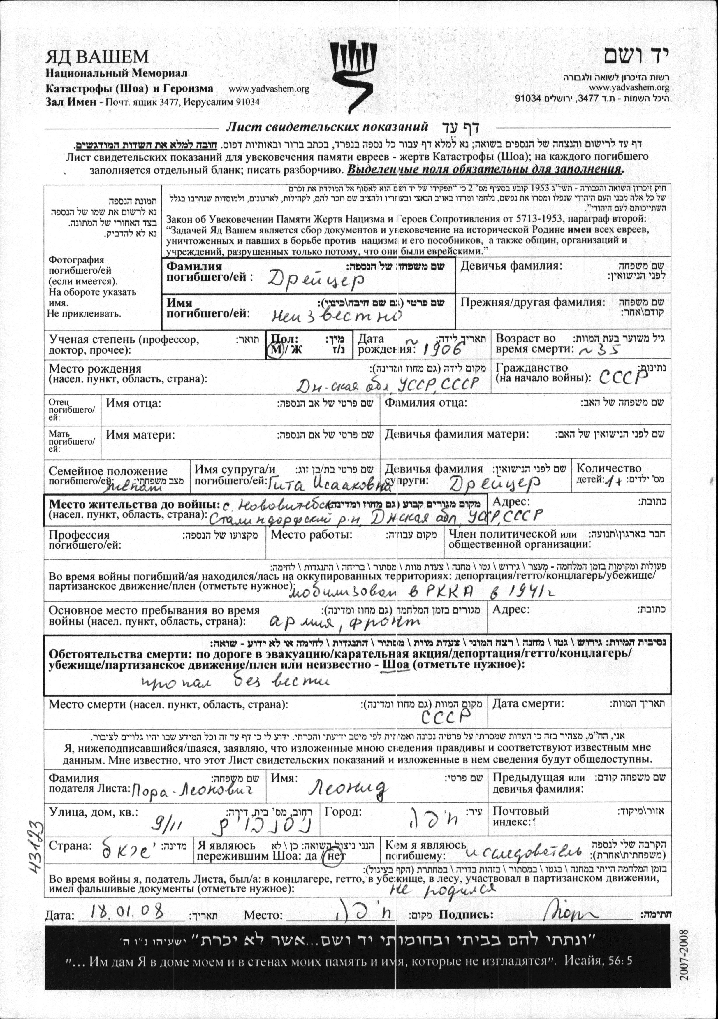 Drejcer First name unknown 1906 Novo Vitebsk, Ukraine (USSR) Page of Testimony