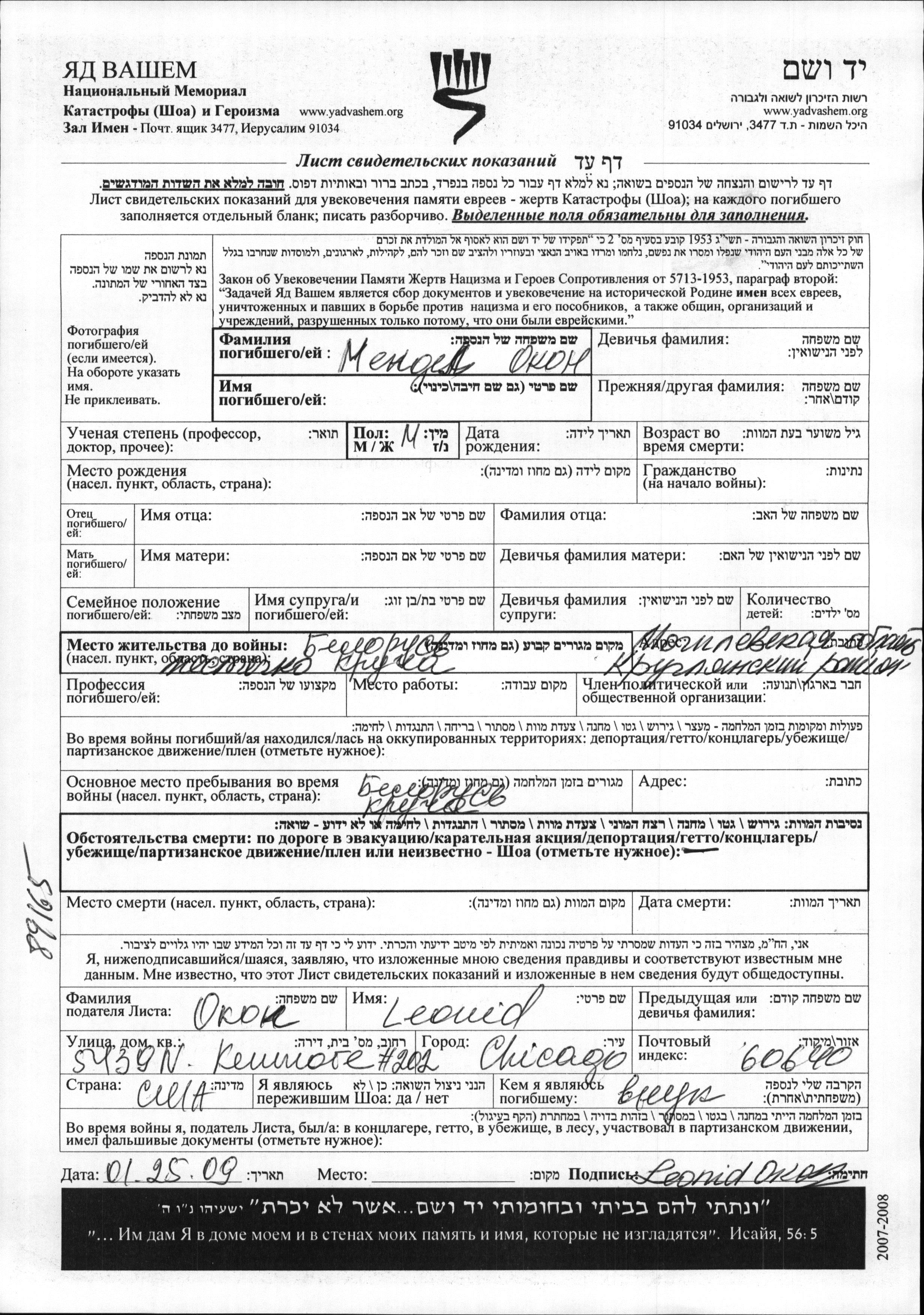 Mendel Okon. He was married. Prior to WWII he lived in Krucha, Belorussia (USSR). During the war he was in Krucha, Belorussia (USSR). Mendel was murdered in the Shoah. Place of death: Ghetto, Belorussia (USSR).