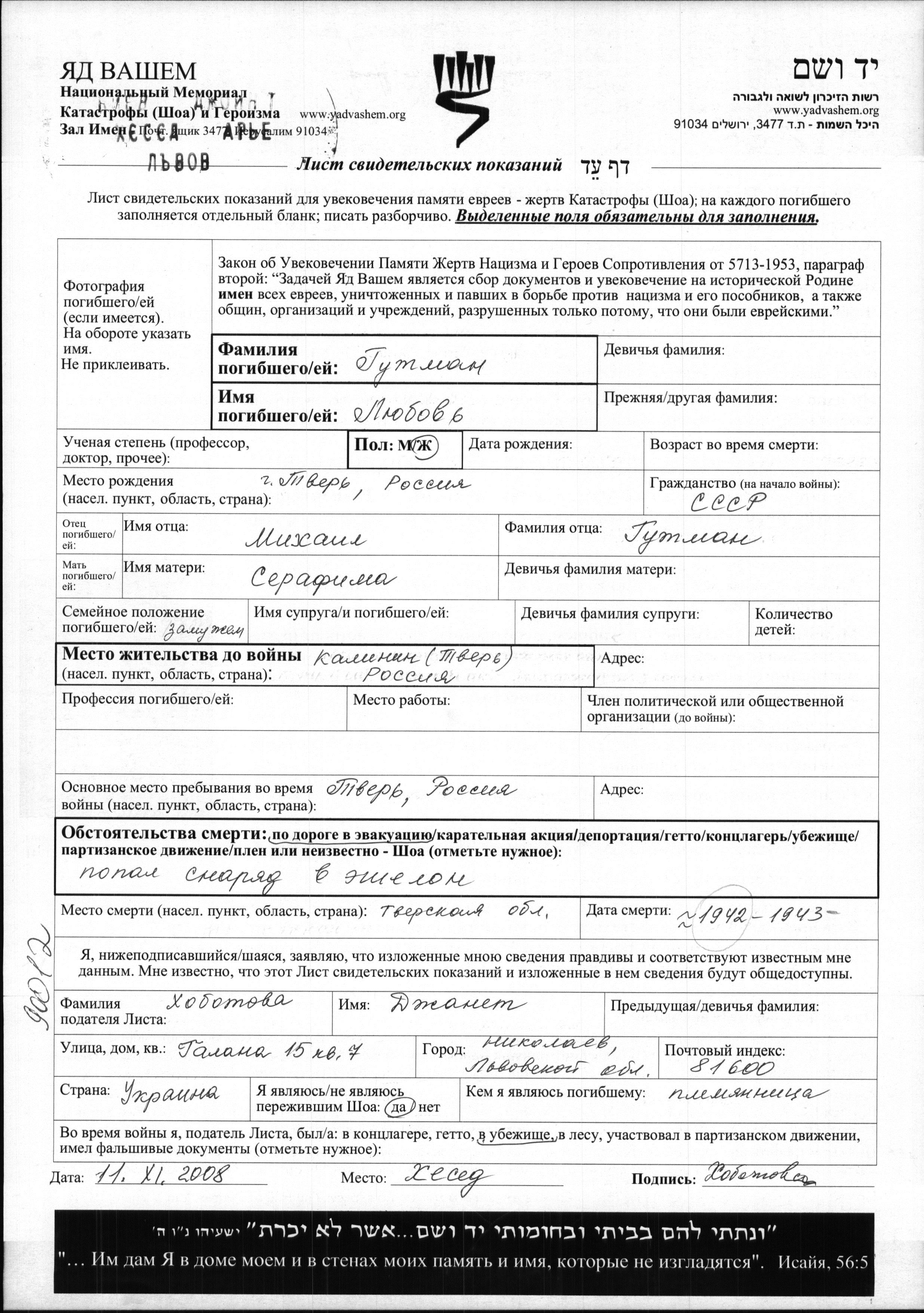 Gutman Lyubov Tver, Russia (USSR) Page of Testimony