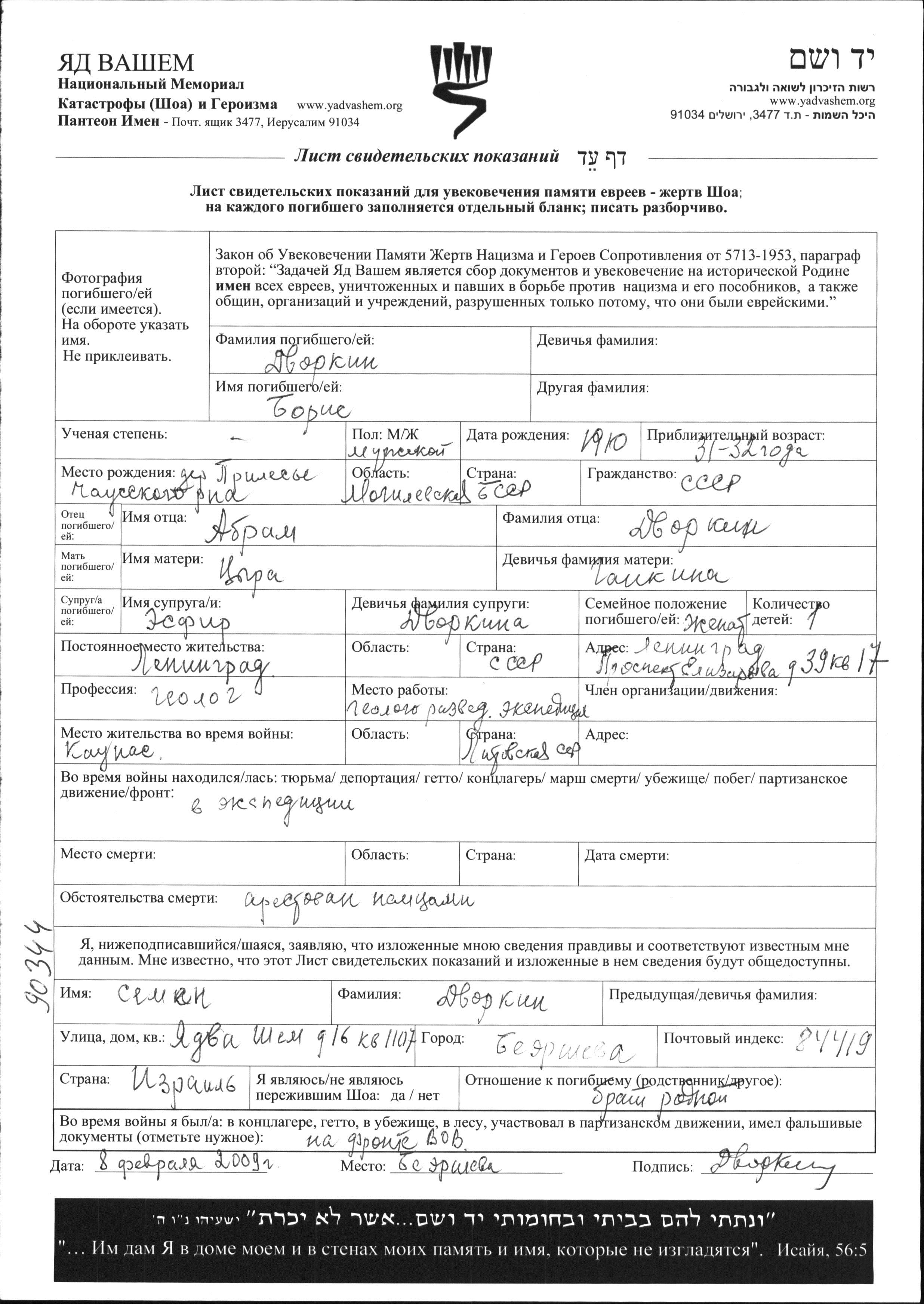Boris Dvorkin was born in Prilesye, Belorussia (USSR), 1910 to Abram and Tzyra nee Galkina. He was a geolog and married to Esfir. Prior to WWII he lived in Leningrad, Russia (USSR). During the war he was in Kaunas, Lithuania. Boris was murdered in the Shoah. Place of death: Kaunas, Lithuania.