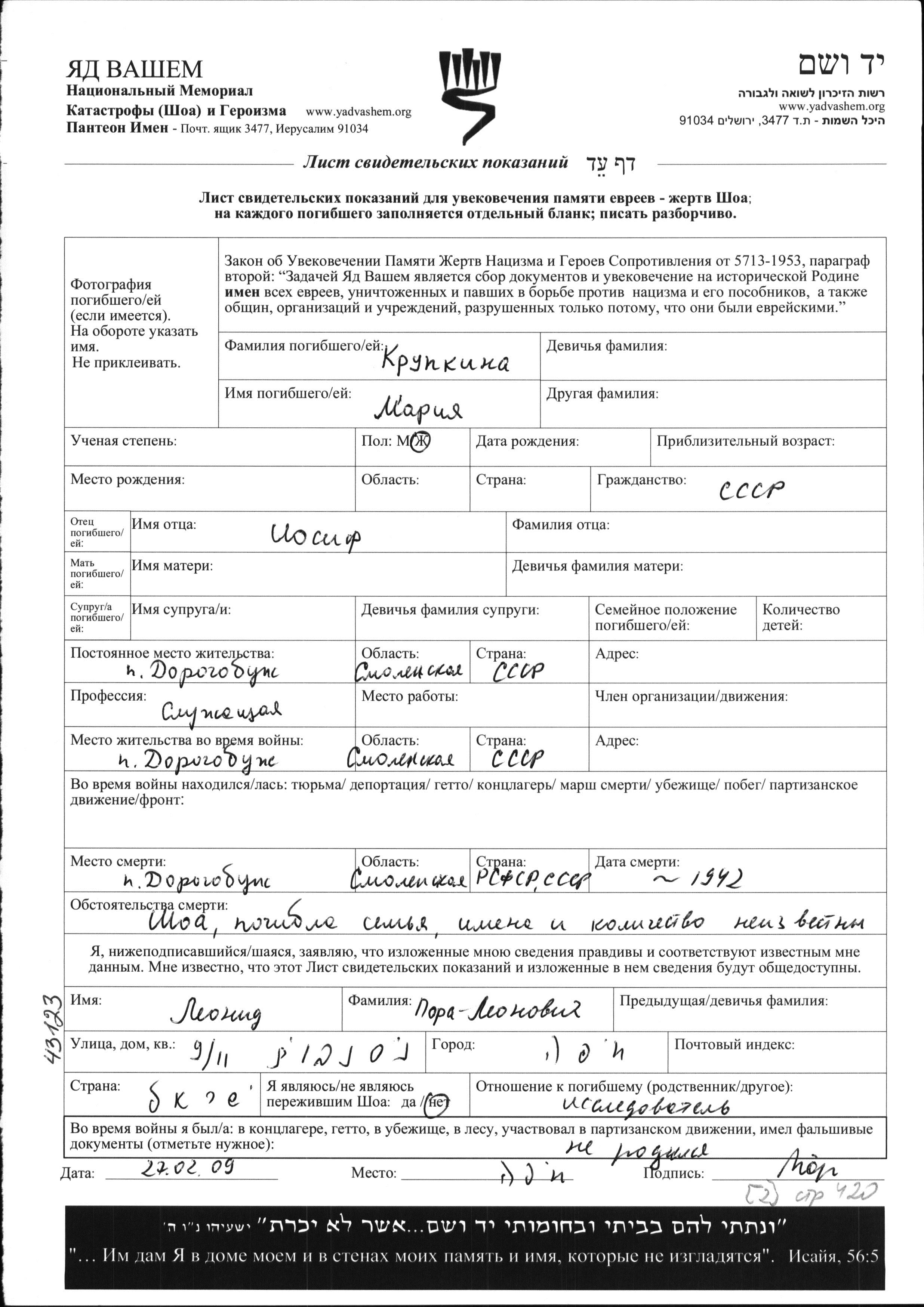 Mariya Krupkina was born to Iosif. She was an employee. Prior to WWII she lived in Dorogobuzh, Russia (USSR). During the war she was in Dorogobuzh, Russia (USSR). Mariya was murdered in the Shoah. Place of death: Dorogobuzh, Russia (USSR), 1942.