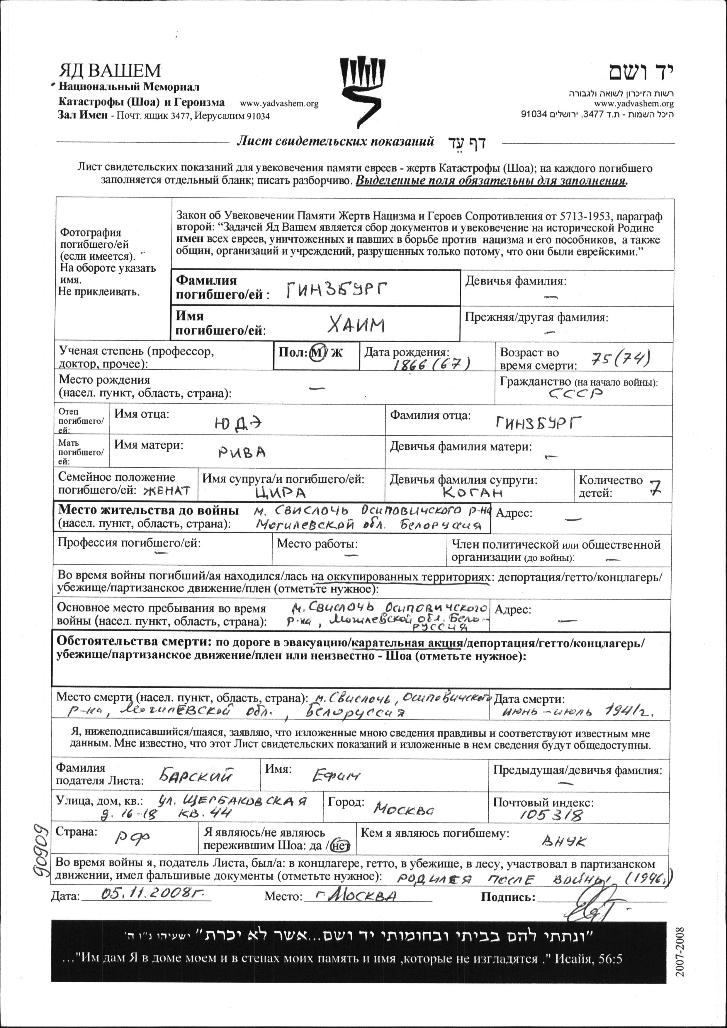 Khaim Ginzburg was born, 1866 to Yude and Riva. He was married to Tzira nee Kogan. Prior to WWII he lived in Svisloch, Belorussia (USSR). During the war he was in Svisloch, Belorussia (USSR). Khaim was murdered in the Shoah. Place of death: Svisloch, Belorussia (USSR), 06/1941.
