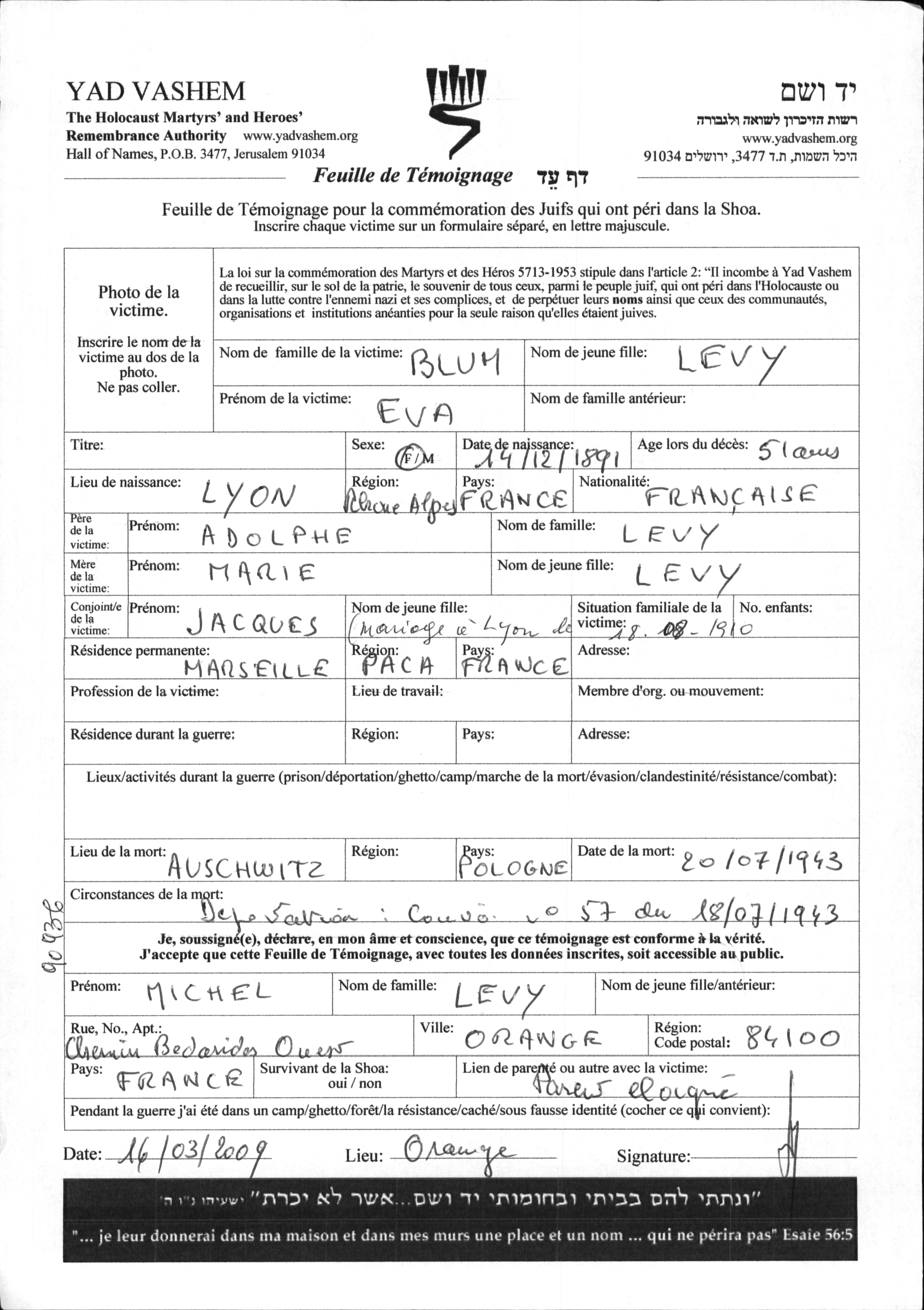Eva Blum nee Levy was born in Lyon, France, 1891 to Adolphe and Marie. She was married to Jacques. Prior to WWII she lived in Marseille, France. During the war she was in France. Eva was murdered in the Shoah. Place of death: Auschwitz, Poland, 20/07/1943.