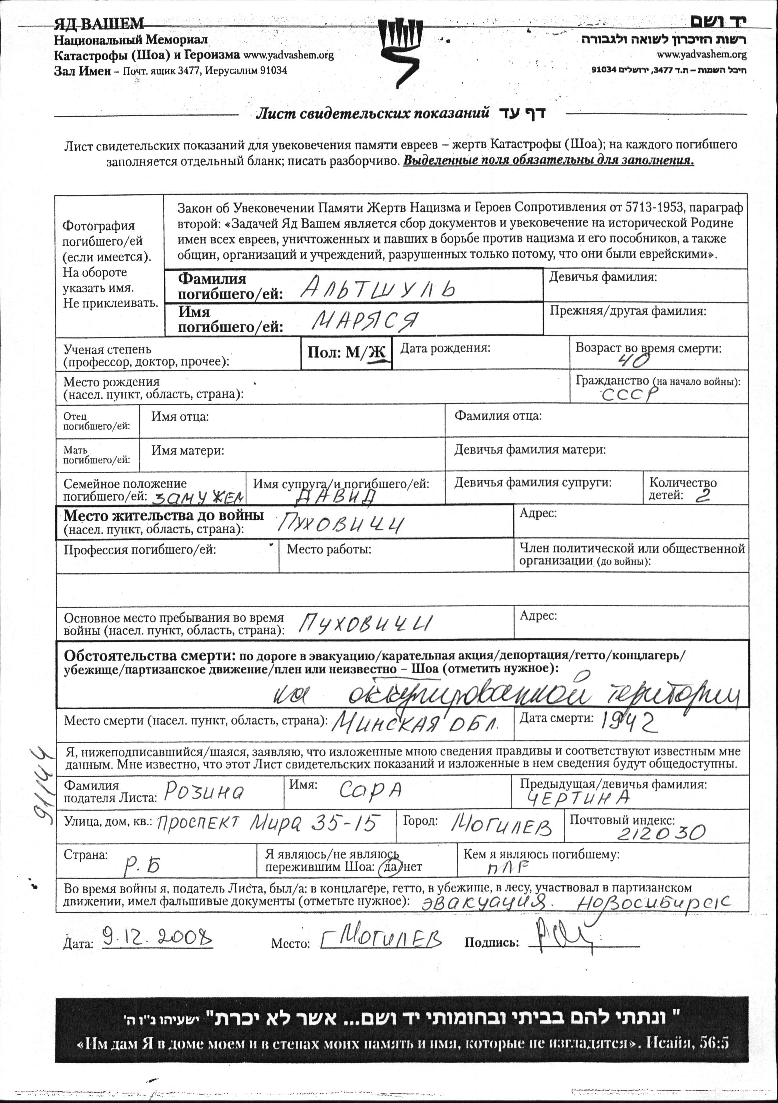 Altshul Maryasya Pukhovichi, Belorussia (USSR) Page of Testimony