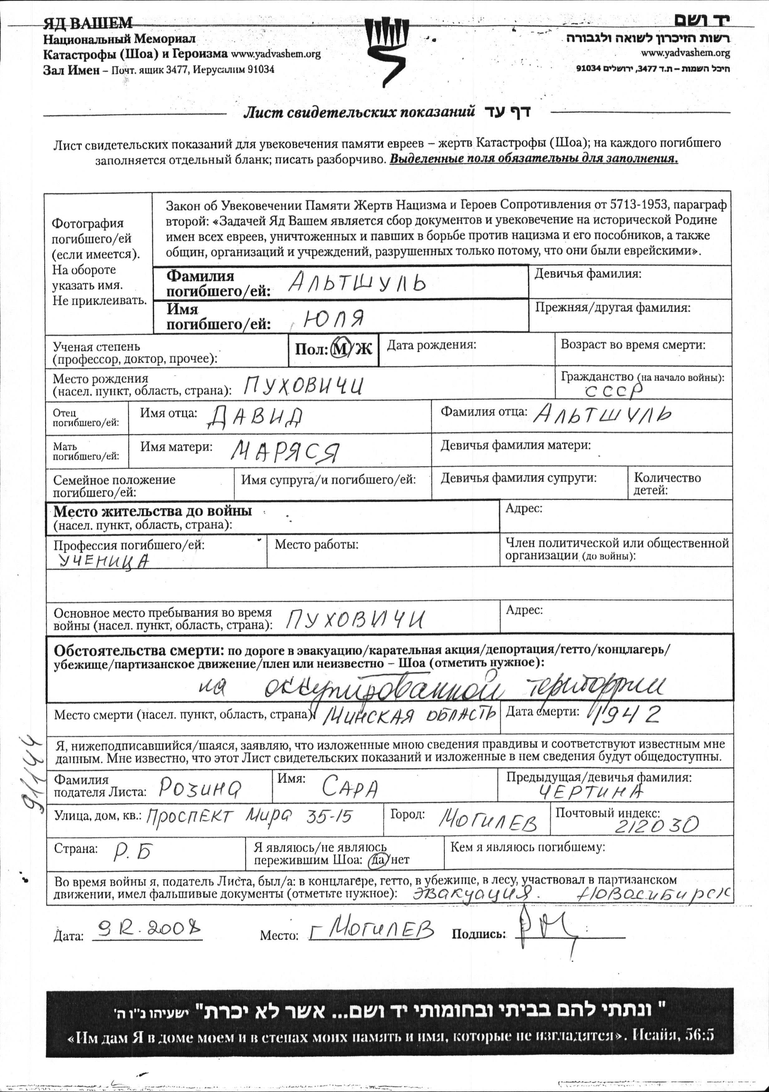 Altshul Yulya Pukhovichi, Belorussia (USSR) Page of Testimony