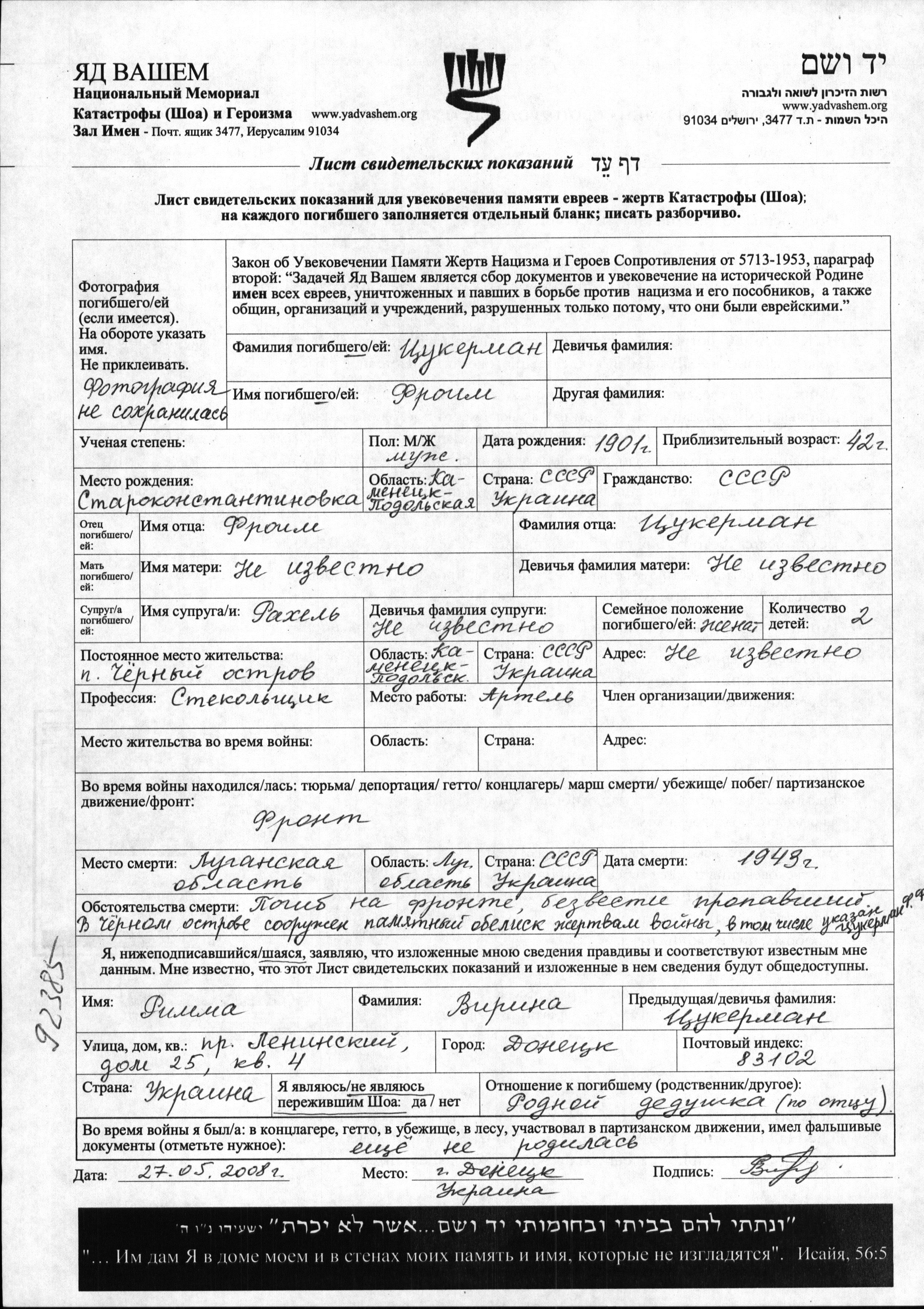 Tzukerman Froim 1901 Cherny Ostrov, Ukraine (USSR) Page of Testimony
