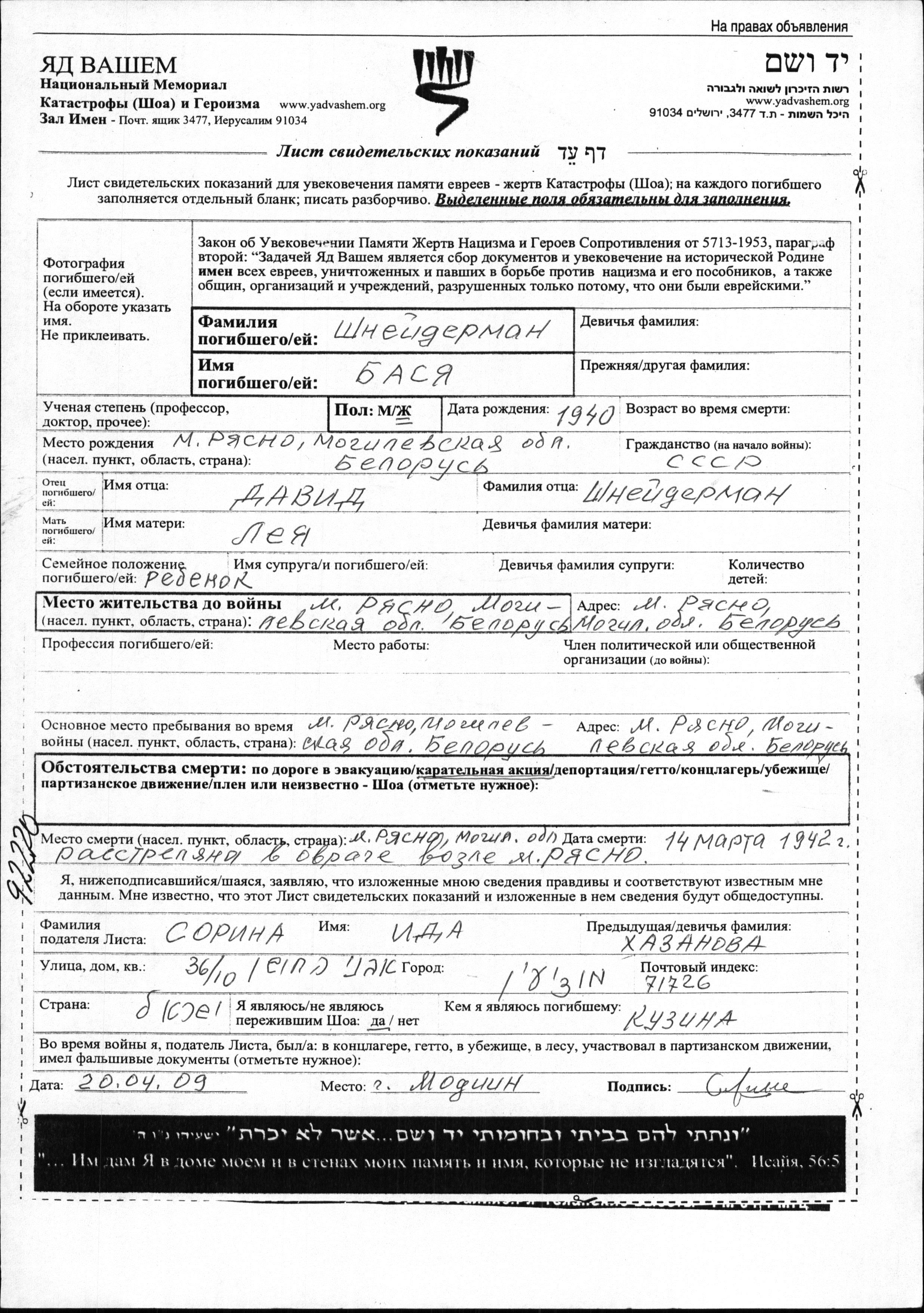 Shneiderman Basya 1940 Ryasno, Belorussia (USSR) Page of Testimony