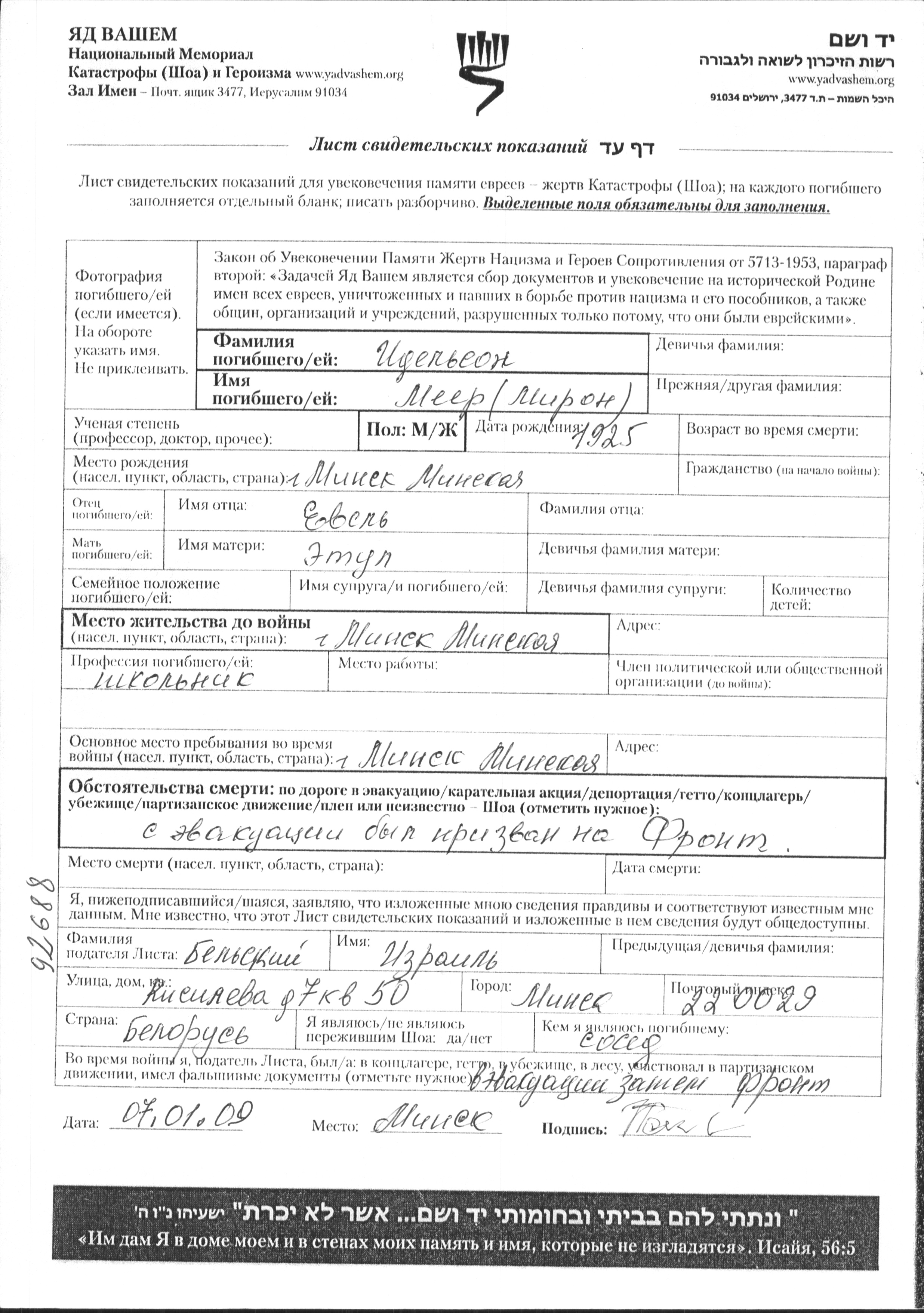 Meyer Miron Idelson was born in Minsk, Belorussia (USSR), 1925 to Yevel and Etul. He was a pupil and teenager. Prior to WWII he lived in Minsk, Belorussia (USSR). During the war he was in the Soviet armed forces. Meyer Miron was killed in military service in WWII.