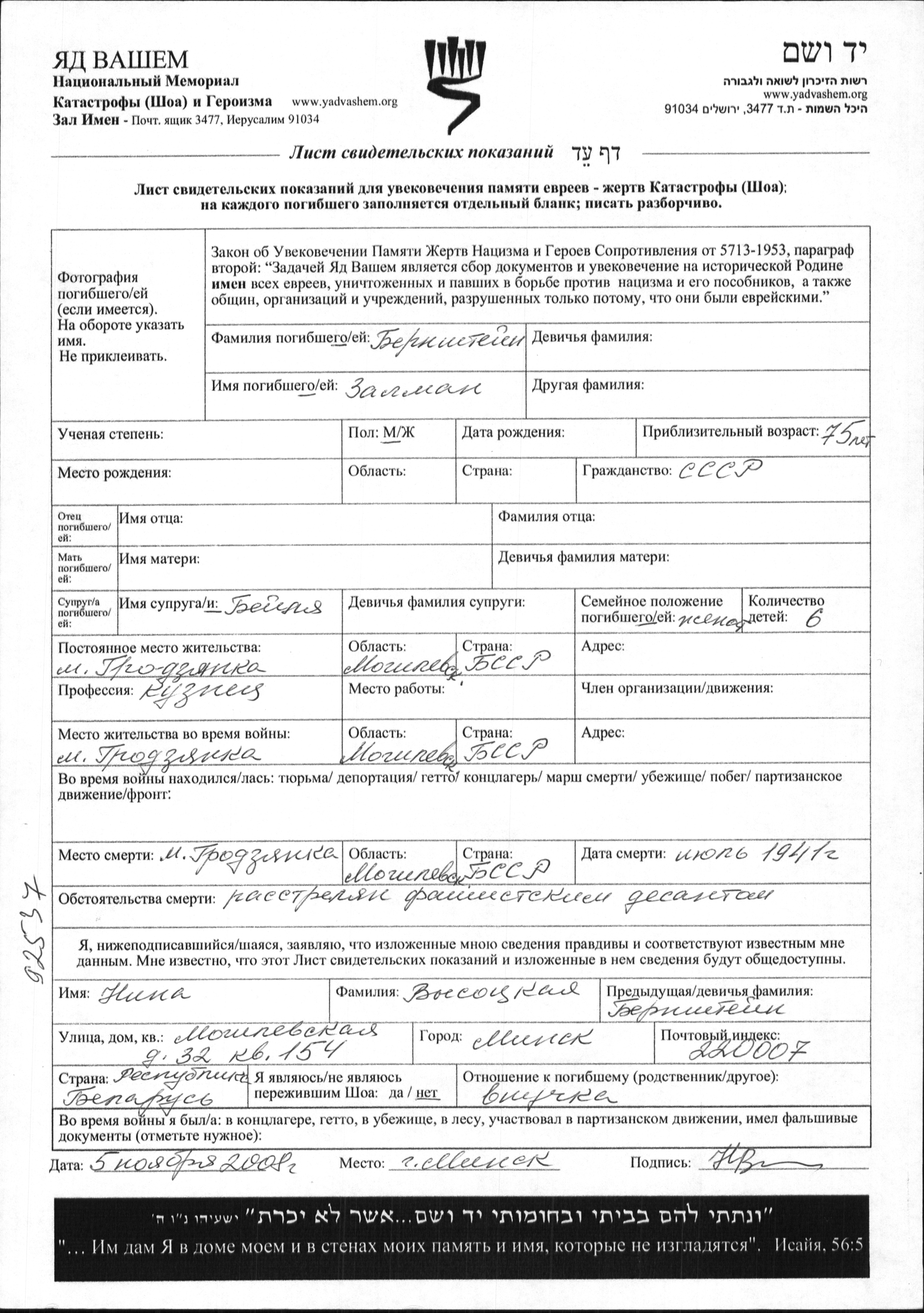 Zalman Bernshtein. He was a blacksmith and married to Beilya. Prior to WWII he lived in Grodzyanka, Belorussia (USSR). During the war he was in Grodzyanka, Belorussia (USSR). Zalman was murdered in the Shoah. Place of death: Grodzyanka, Belorussia (USSR), 07/1941.