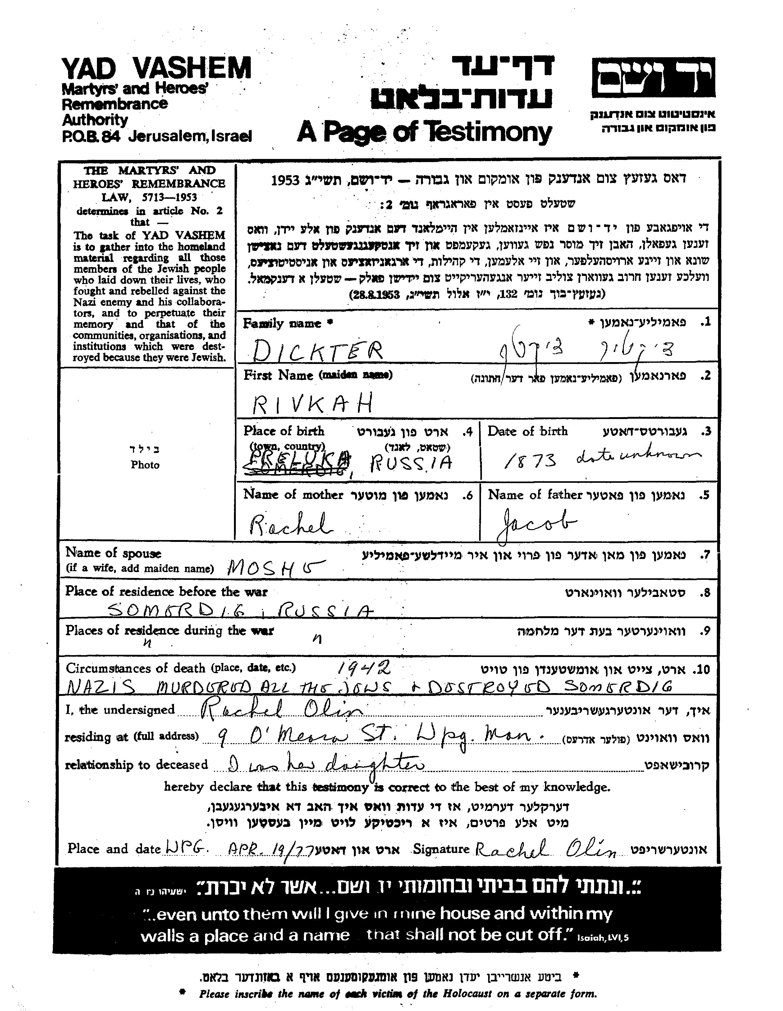 Dickter Rivkah 1873 Samgorodok, Ukraine (USSR) Page of Testimony