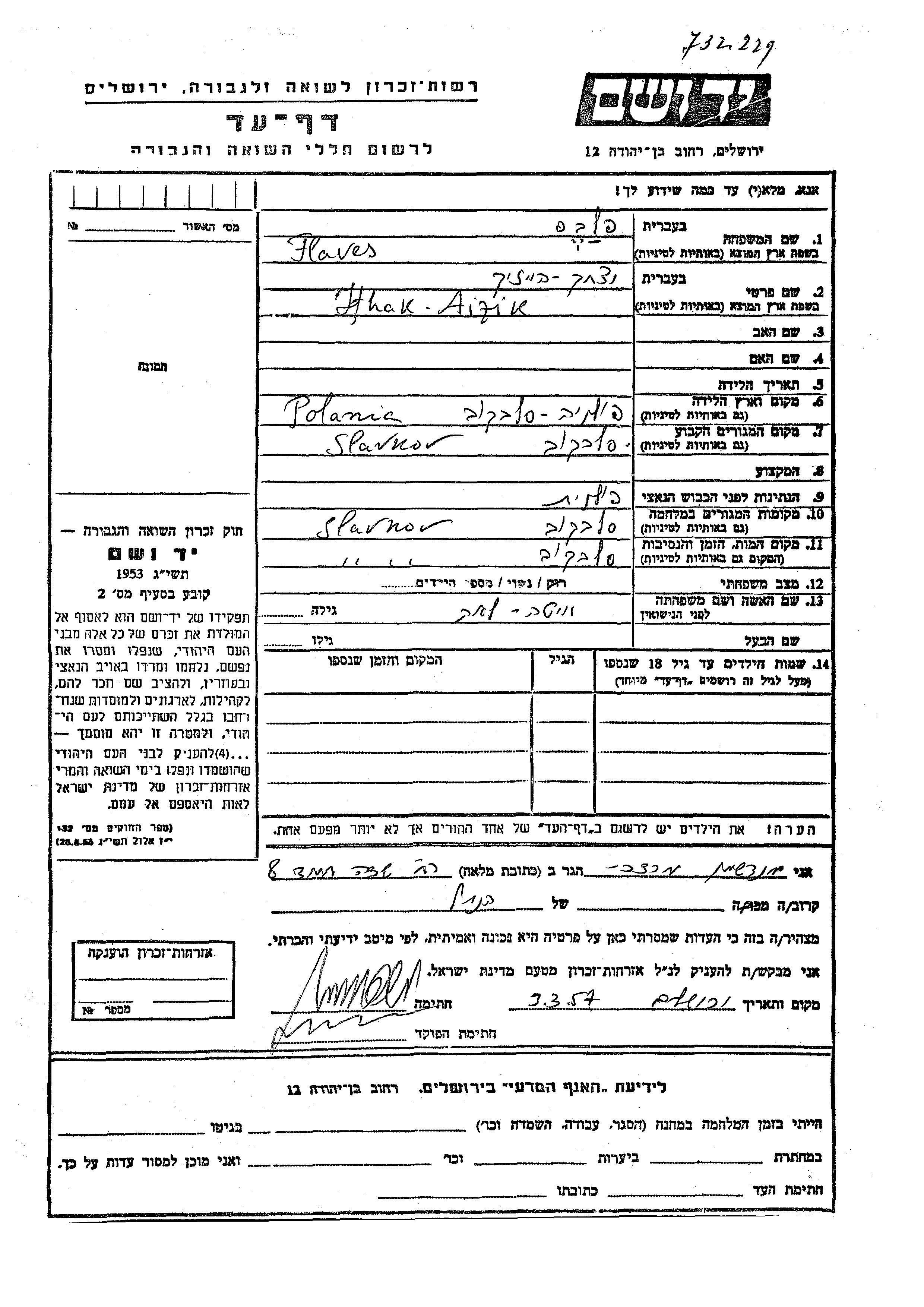 Ithak Haizik Flaves was born in Slawkow, Poland. He was married to Ita Lea. Prior to WWII he lived in Slawkow, Poland. During the war he was in Slawkow, Poland. Ithak Haizik was murdered in the Shoah. Place of death: Slawkow, Poland.