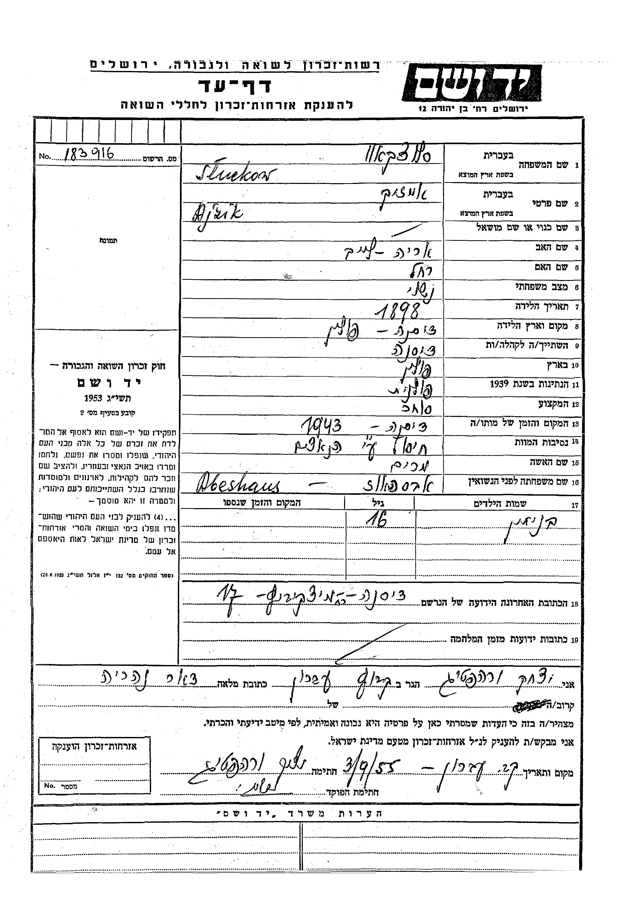 Ajzik Sluckow was born in Cisna, Poland, 1898 to Arie Leib and Rakhel. He was a merchant and married to Miriam nee Abeshaus. Prior to WWII he lived in Cisna, Poland. Ajzik was murdered in the Shoah. Place of death: Cisna, Poland, 1943.