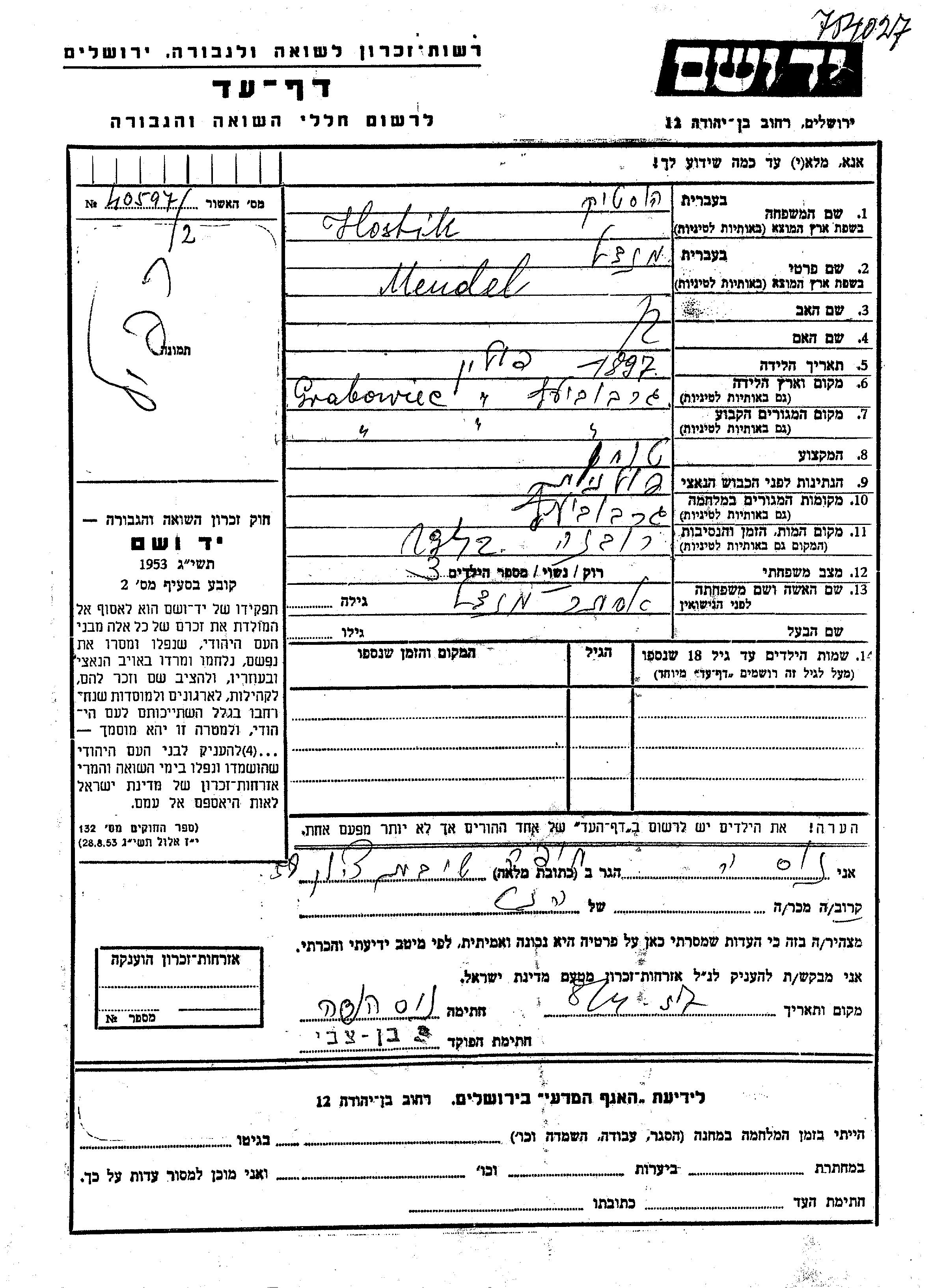 Mendel Hostik was born in Grabowiec, Poland, 1897. He was a miller and married to Ester nee Mandel. Prior to WWII he lived in Grabowiec, Poland. During the war he was in Grabowiec, Poland. Mendel was murdered in the Shoah. Place of death: Rowna, Poland, 1942.