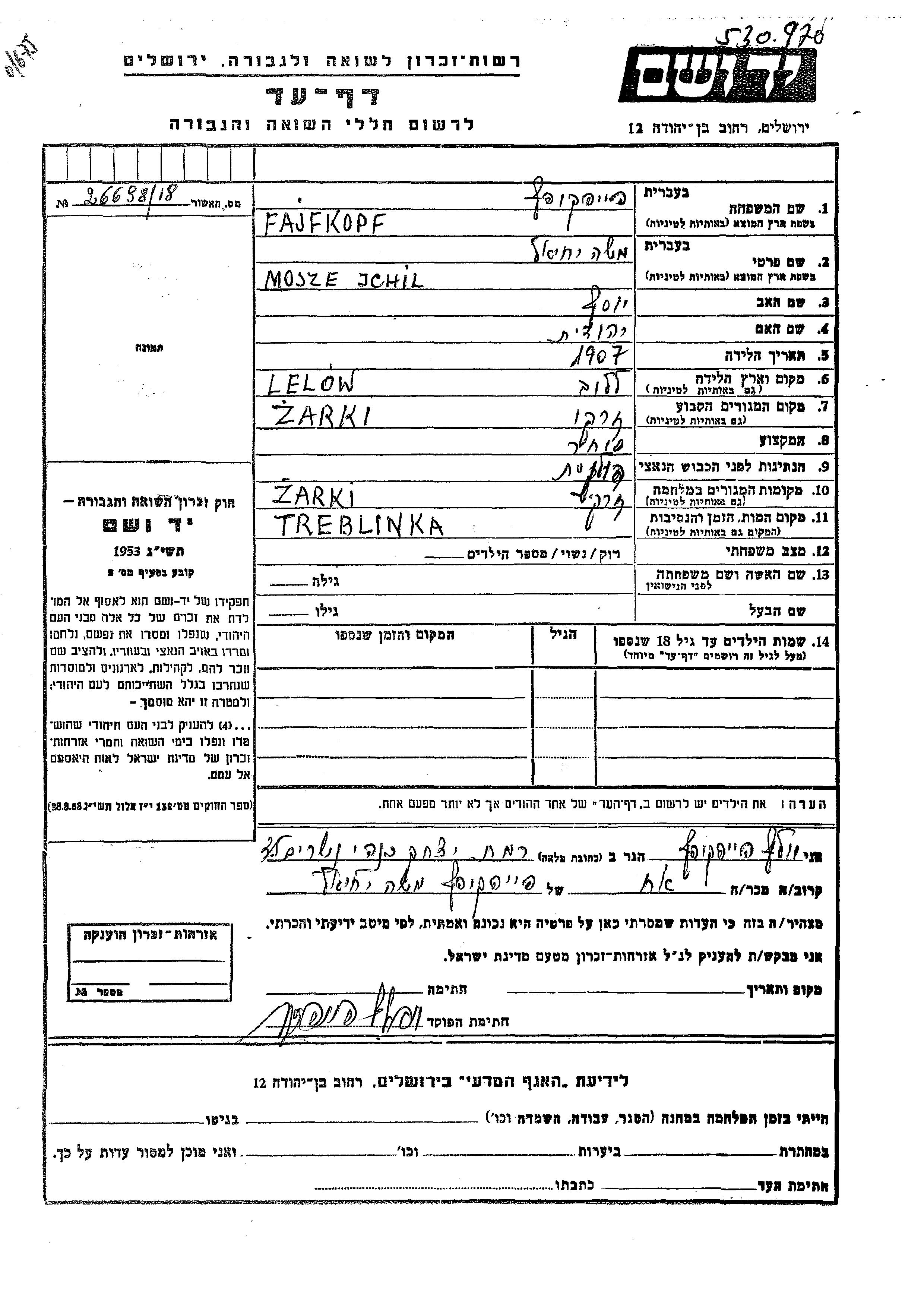 Mosze Jchil Fajfkopf was born in Lelow, Poland, 1907 to Yosef and Yehudit. He was a merchant. Prior to WWII he lived in Zarki, Poland. During the war he was in Zarki, Poland. Mosze Jchil was murdered in the Shoah. Place of death: Treblinka, Poland.