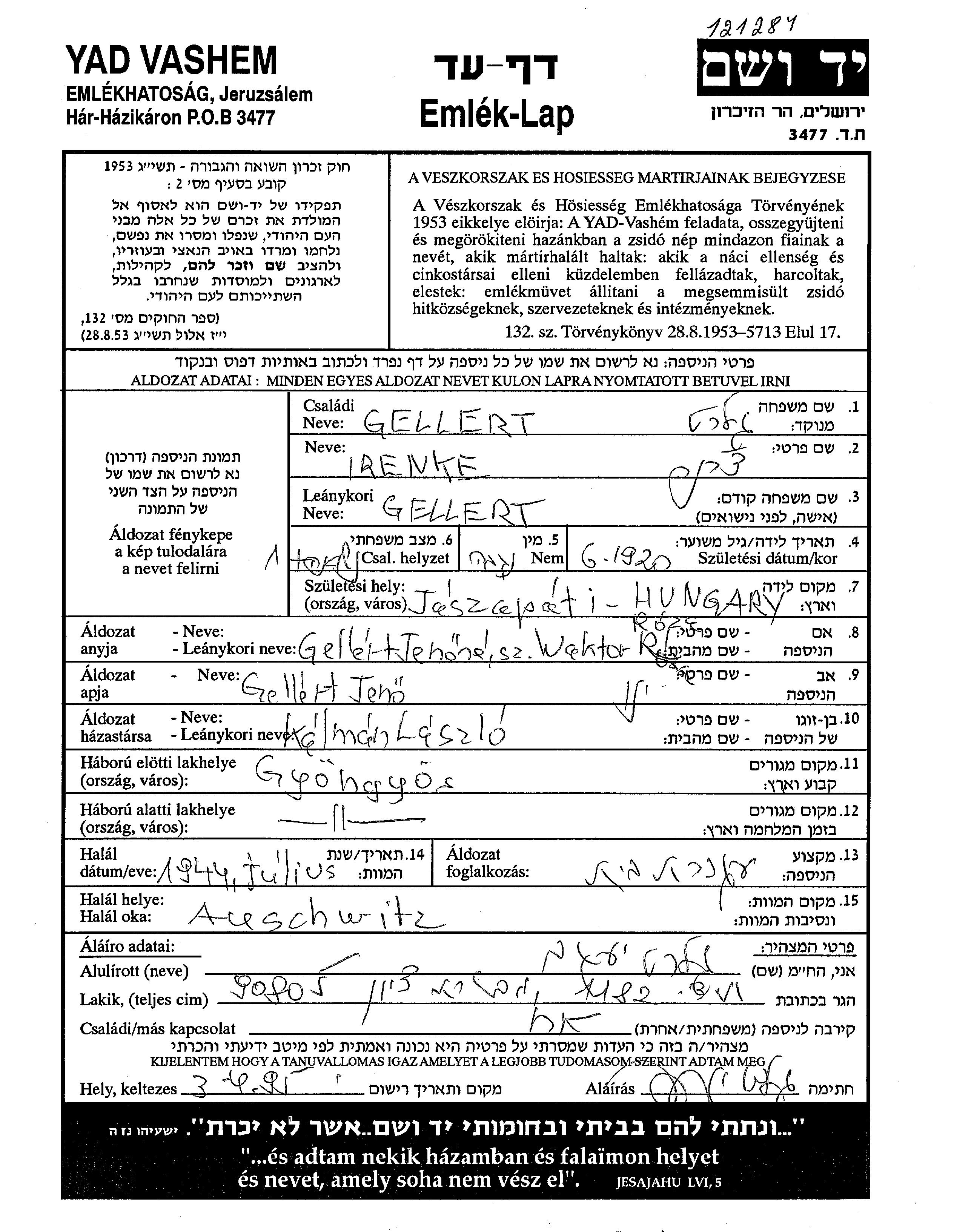 Gellert | Irenke Charna | 1920 | Gyongyos, Hungary | Page of Testimony |