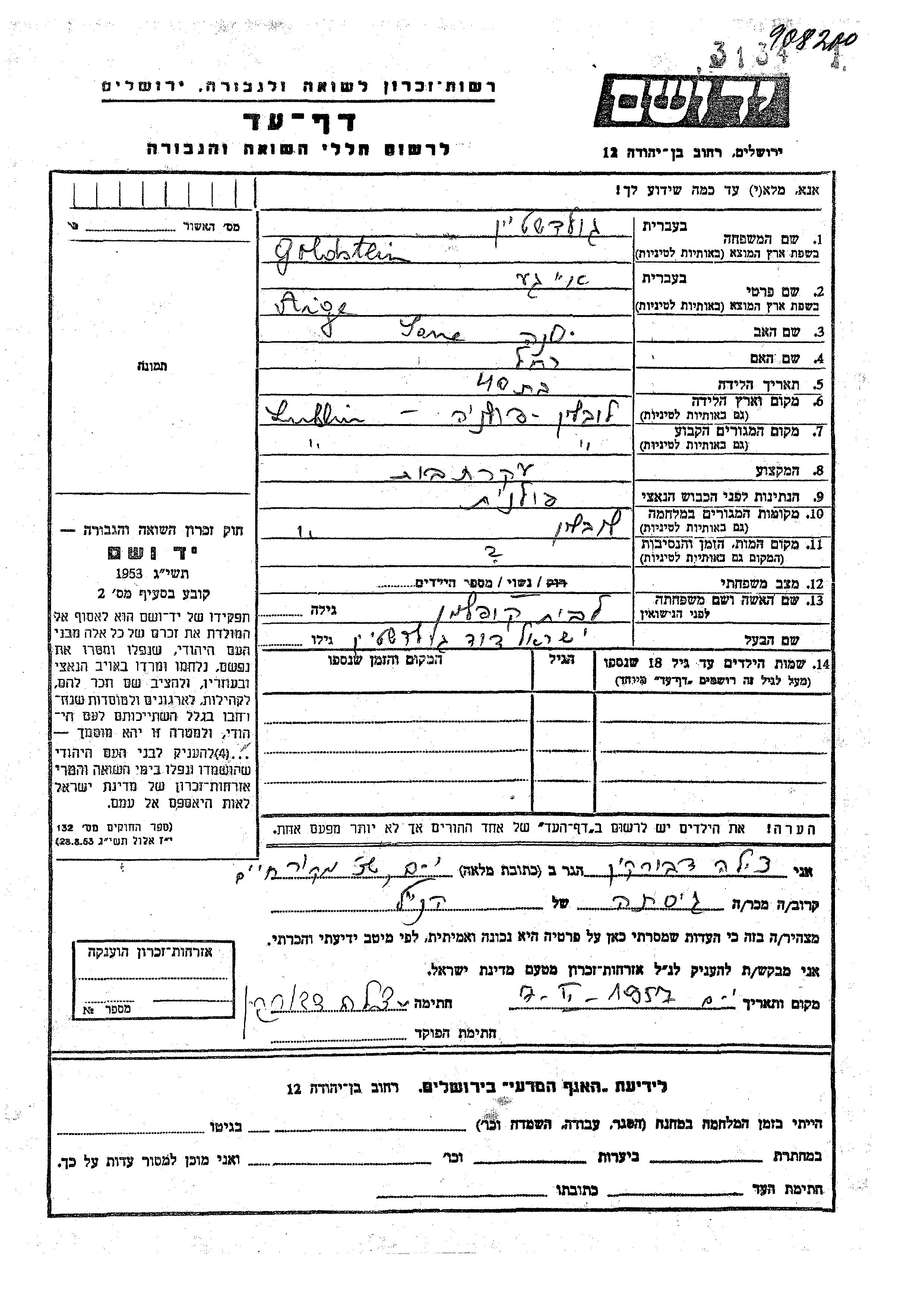 Aige Goldstein nee Kopelman was born in Lublin, Poland to Sana and Rakhel. She was a housewife and married to Yisrael David. Prior to WWII she lived in Lublin, Poland. During the war she was in Lublin, Poland. Aige was murdered in the Shoah.