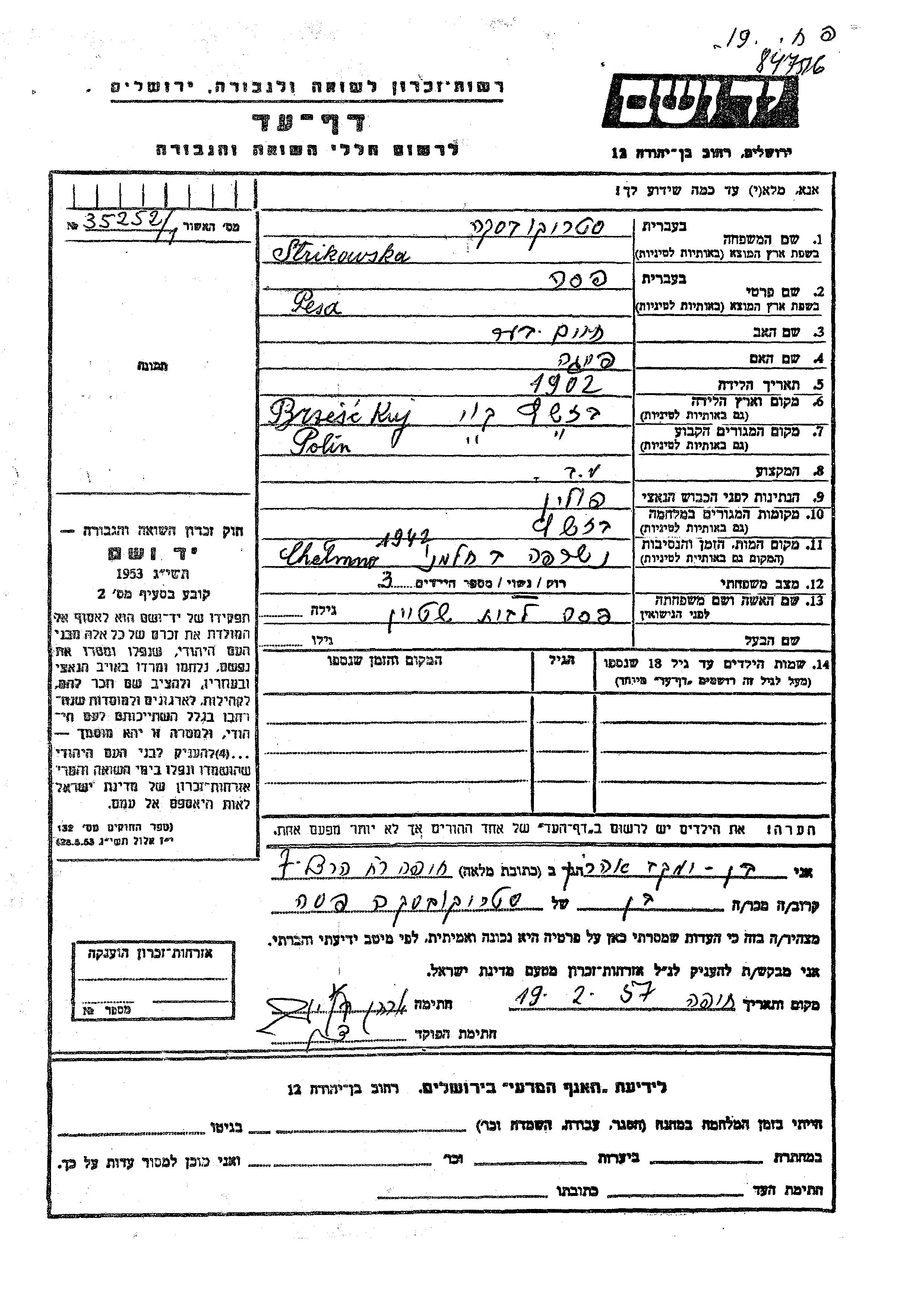 Pesa Strikowska nee Shtein was born in Brzesc Kujawski, Poland, 1902 to Khaim Ber and Feiga. She was a housewife and married. Prior to WWII she lived in Brzesc Kujawski, Poland. During the war she was in Brzesc Kujawski, Poland. Pesa was murdered in the Shoah. Place of death: Chelmno, Poland, 1942.