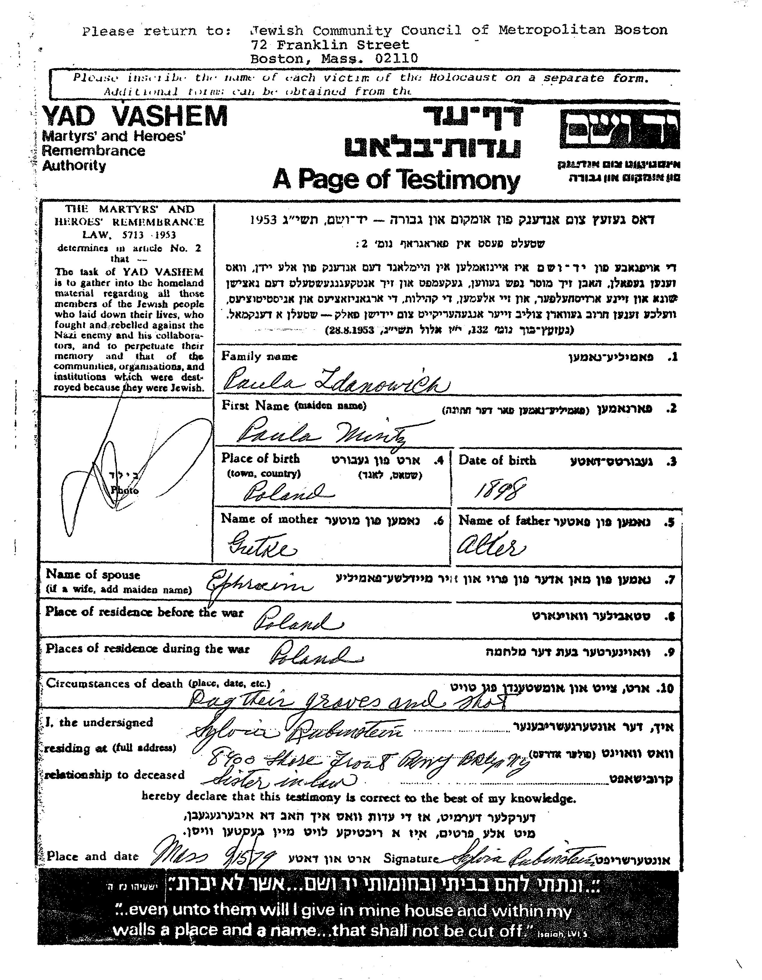 Paula Zdanowich nee Mintz was born in Poland, 1898 to Alter and Gutke. She was married to Ephraim. Prior to WWII she lived in Poland. During the war she was in Poland.