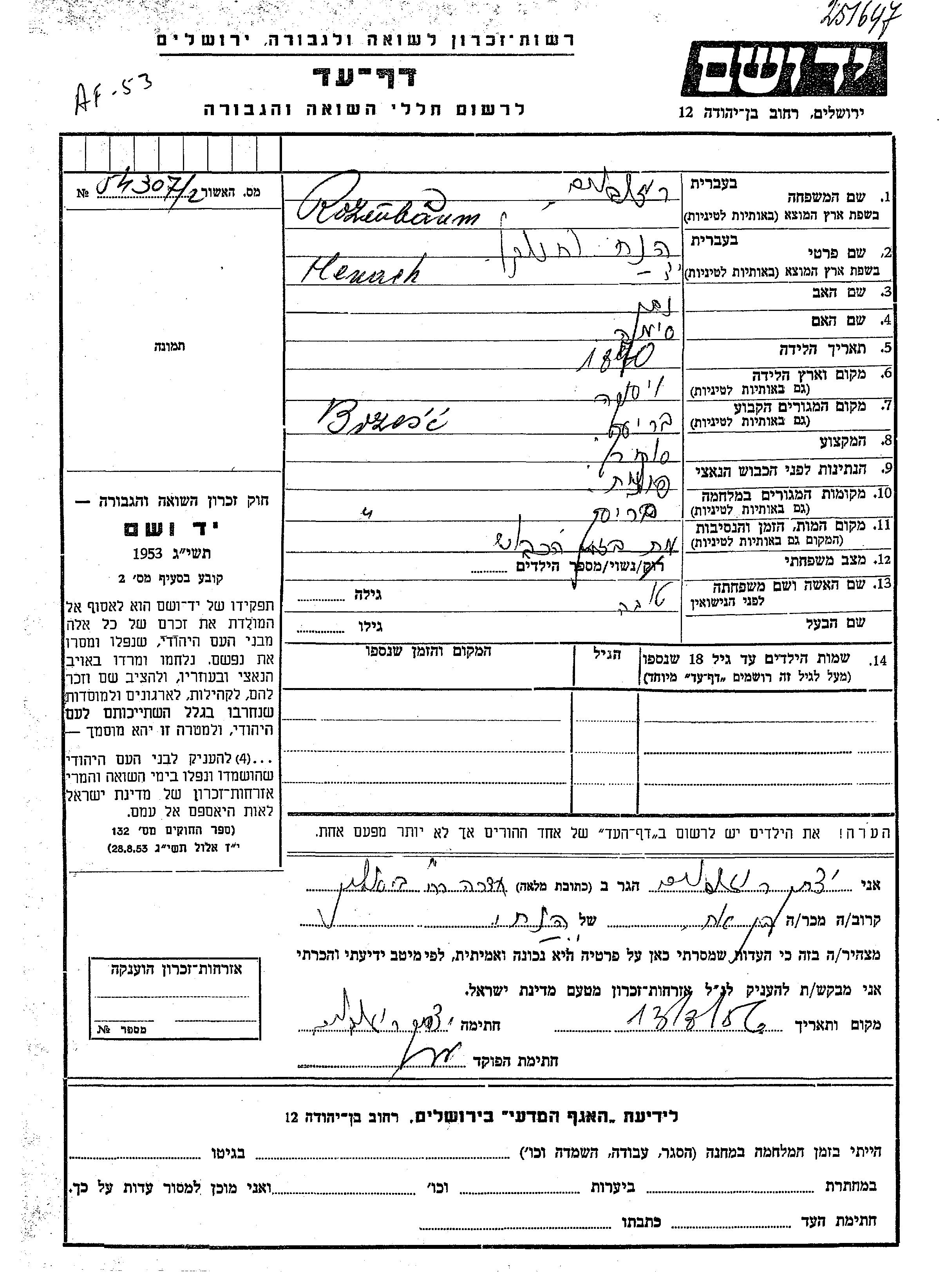 Henach Rozenboim was born in Wysoka, Poland, 1870 to Natan and Sima. He was a merchant and married to Tova. Prior to WWII he lived in Brzesc, Poland. During the war he was in Brzesc, Poland. Henach was murdered in the Shoah.
