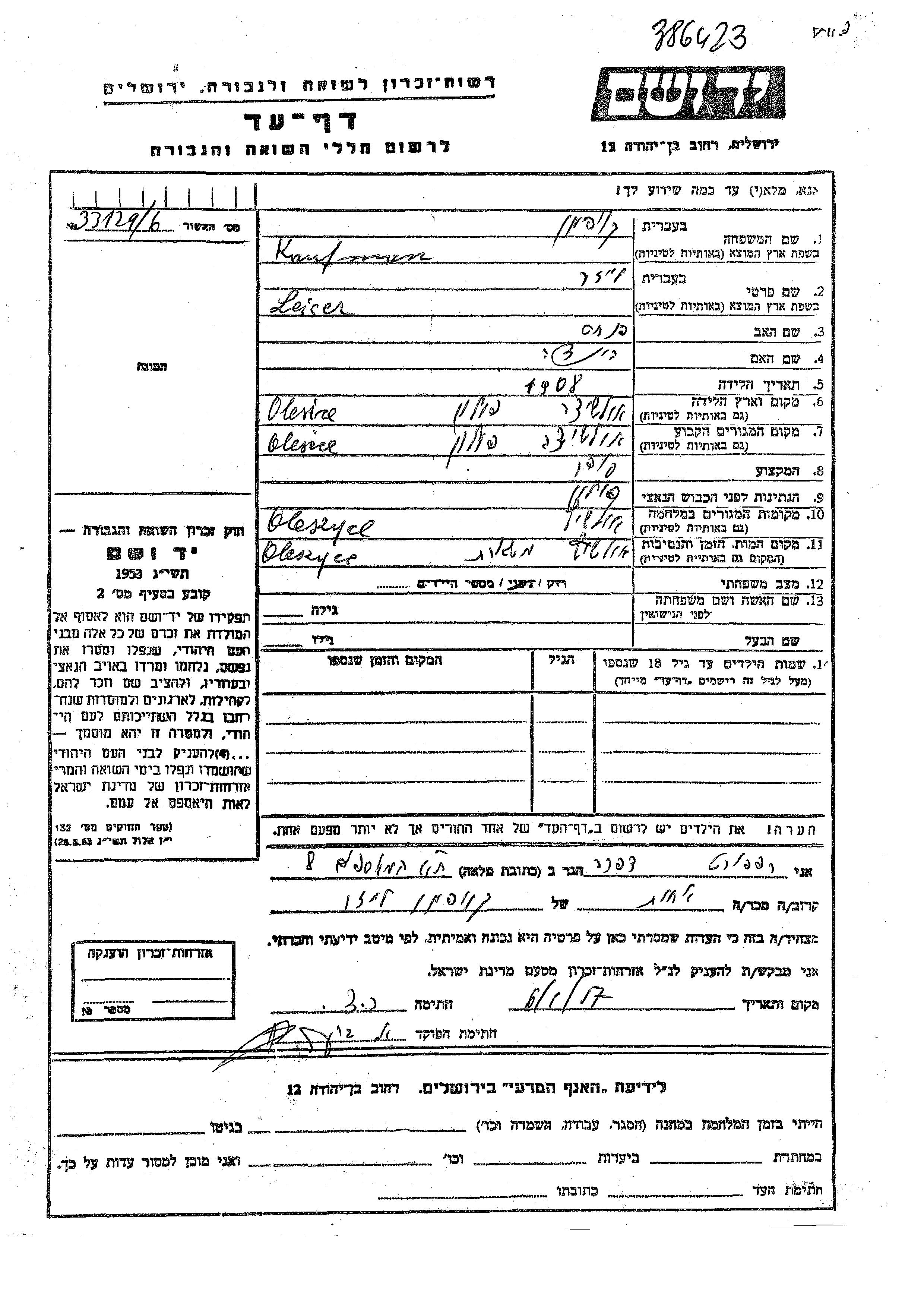Leiser Kaufman was born in Oleszyce, Poland, 1908 to Pinkhas and Hinda. He was a merchant and single. Prior to WWII he lived in Oleszyce, Poland. During the war he was in Oleszyce, Poland. Leiser was murdered in the Shoah. Place of death: Oleszyce, Poland.