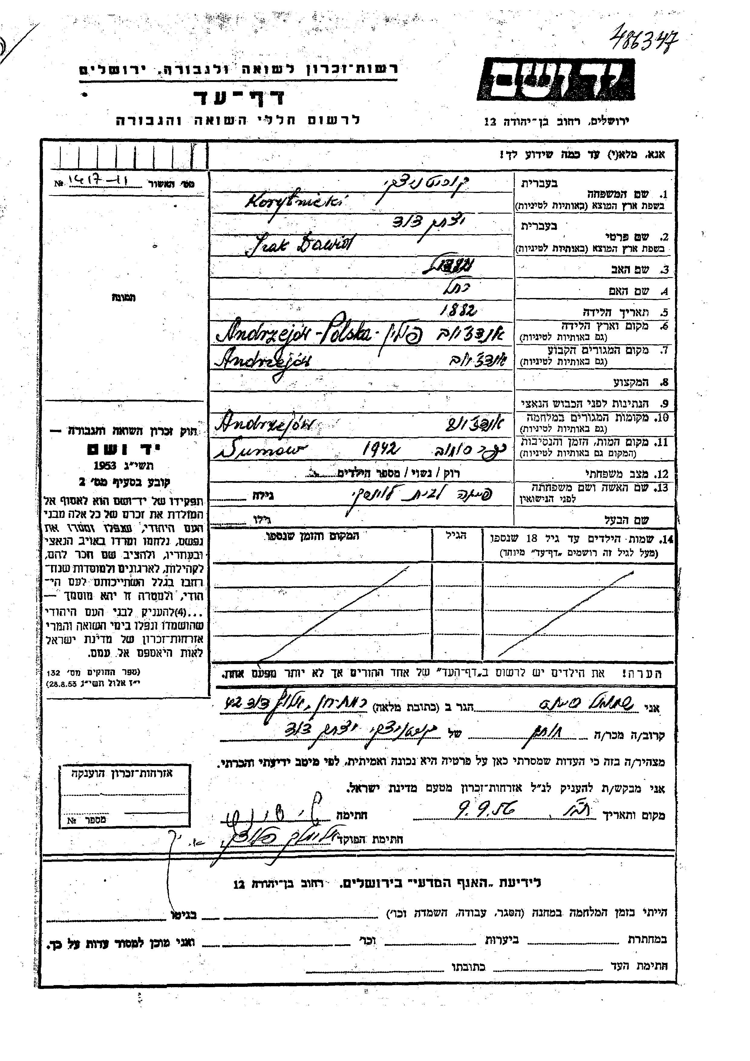 Izak Dawid Korytnicki was born in Andrzejow, Poland, 1882 to Mendol and Rakhel. He was married to Feiga nee Levinski. Prior to WWII he lived in Andrzejow, Poland. During the war he was in Andrzejow, Poland. Izak Dawid was murdered in the Shoah. Place of death: Szumowo, Poland, 1942.