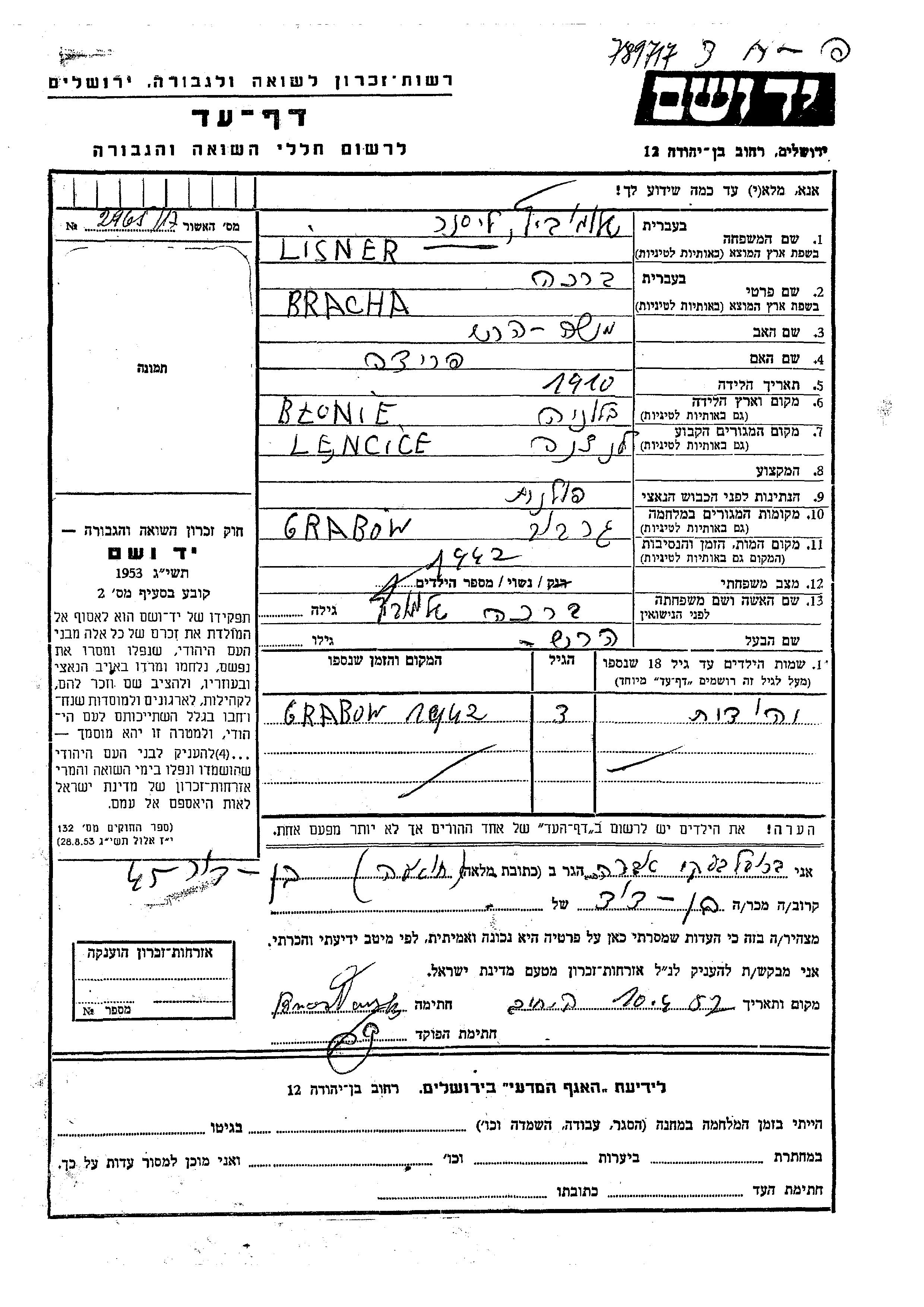 Bracha Lisner nee Shlamovitz was born in Blonie, Poland, 1910 to Moshe Hersh and Frida. She was married to Hersh. Prior to WWII she lived in Lencice, Poland. During the war she was in Grabow, Poland. Bracha was murdered in the Shoah. Place of death: unknown, 1942.