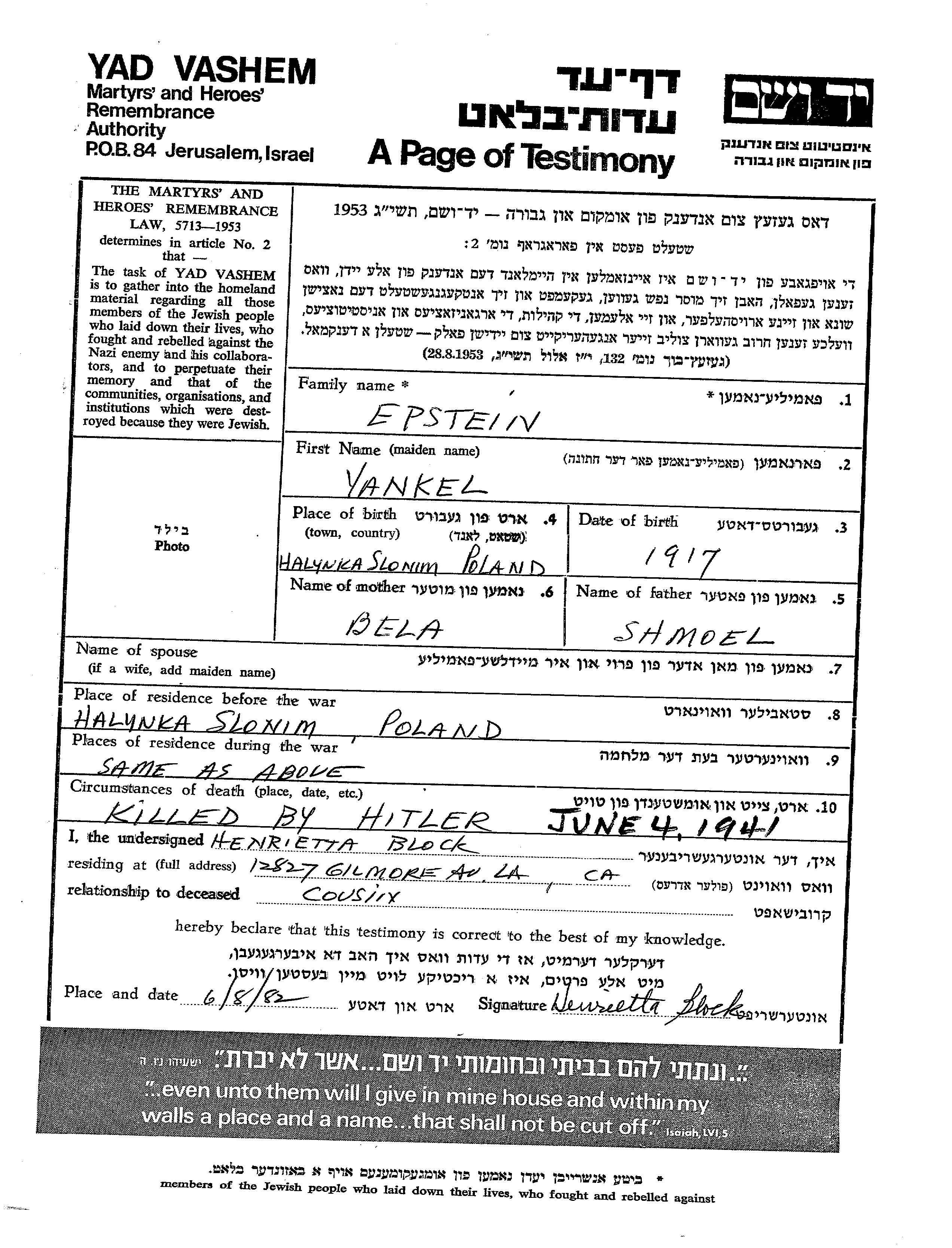 Yankel Epstein was born in Halynka, Poland, 1917 to Shmoel and Bela. Prior to WWII he lived in Halynka, Poland. During the war he was in Halynka, Poland. Yankel was murdered in the Shoah. Place of death: unknown, 04/06/1941.