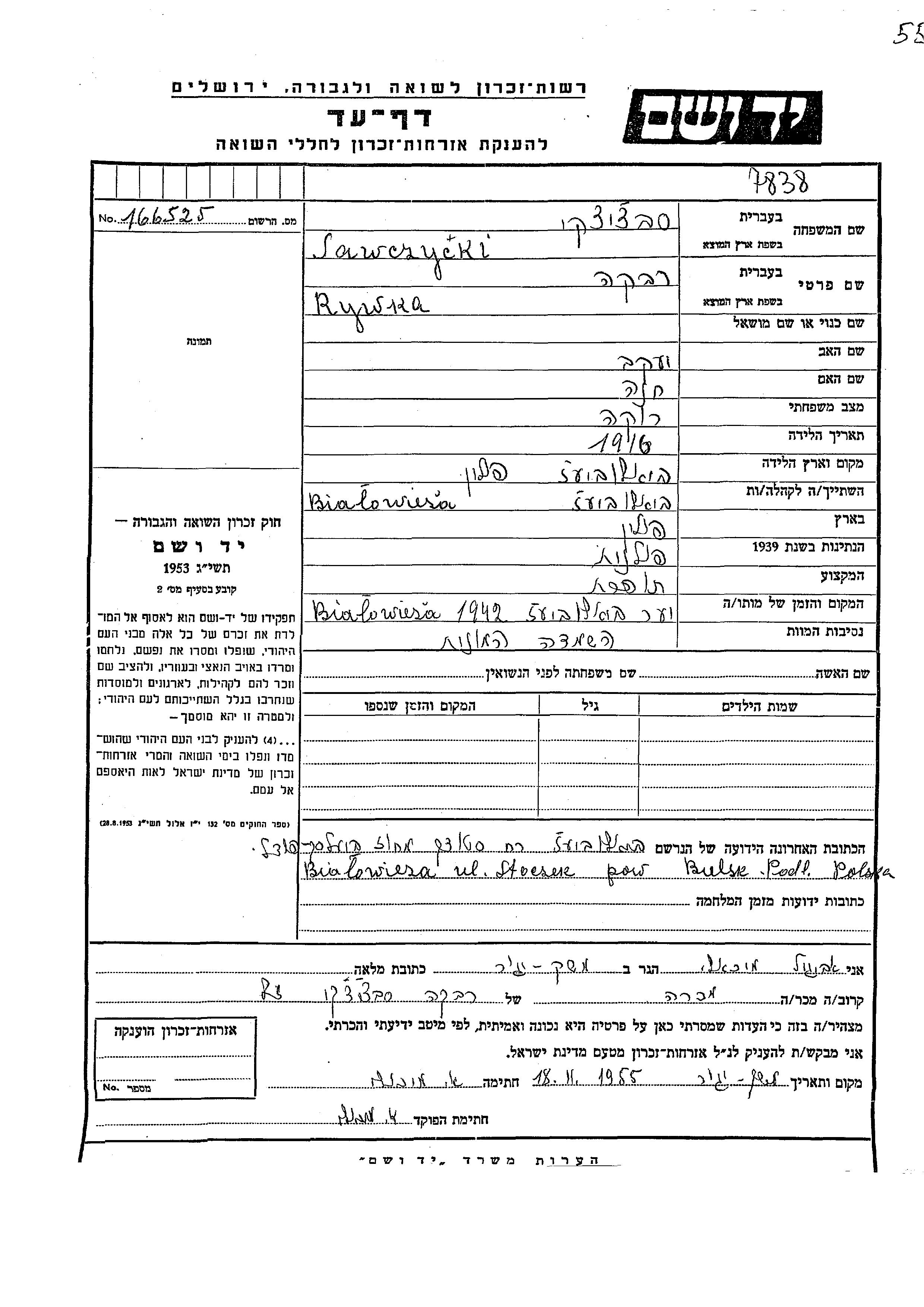 Sawczycki Rywka 1916 unstated place, Page of Testimony