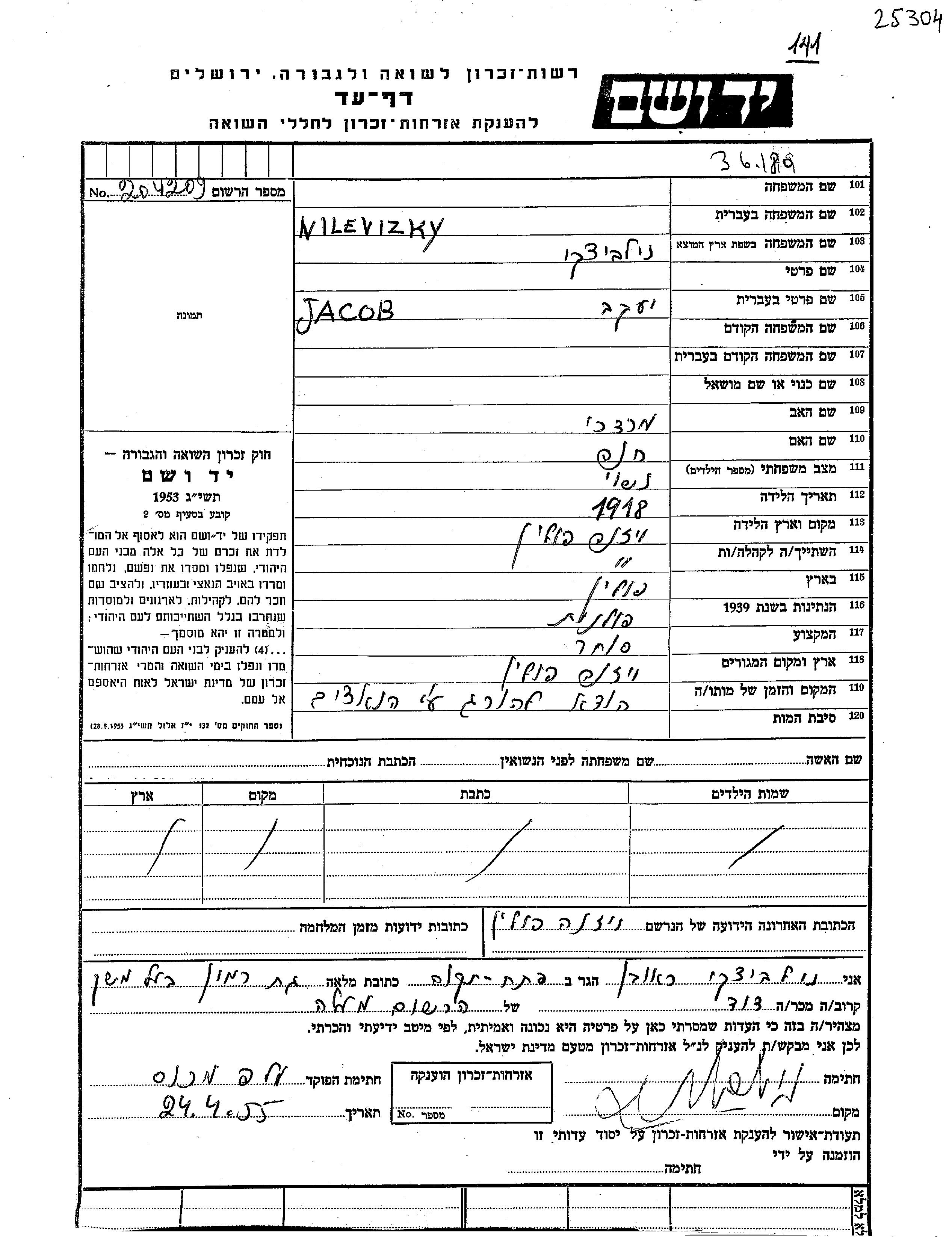 Jacob Nilevizky was born in Wizna, Poland, 1918 to Mordekhai and Khana. He was a merchant and married. Prior to WWII he lived in Wizna, Poland. During the war he was in Wizna, Poland. Jacob was murdered in the Shoah.