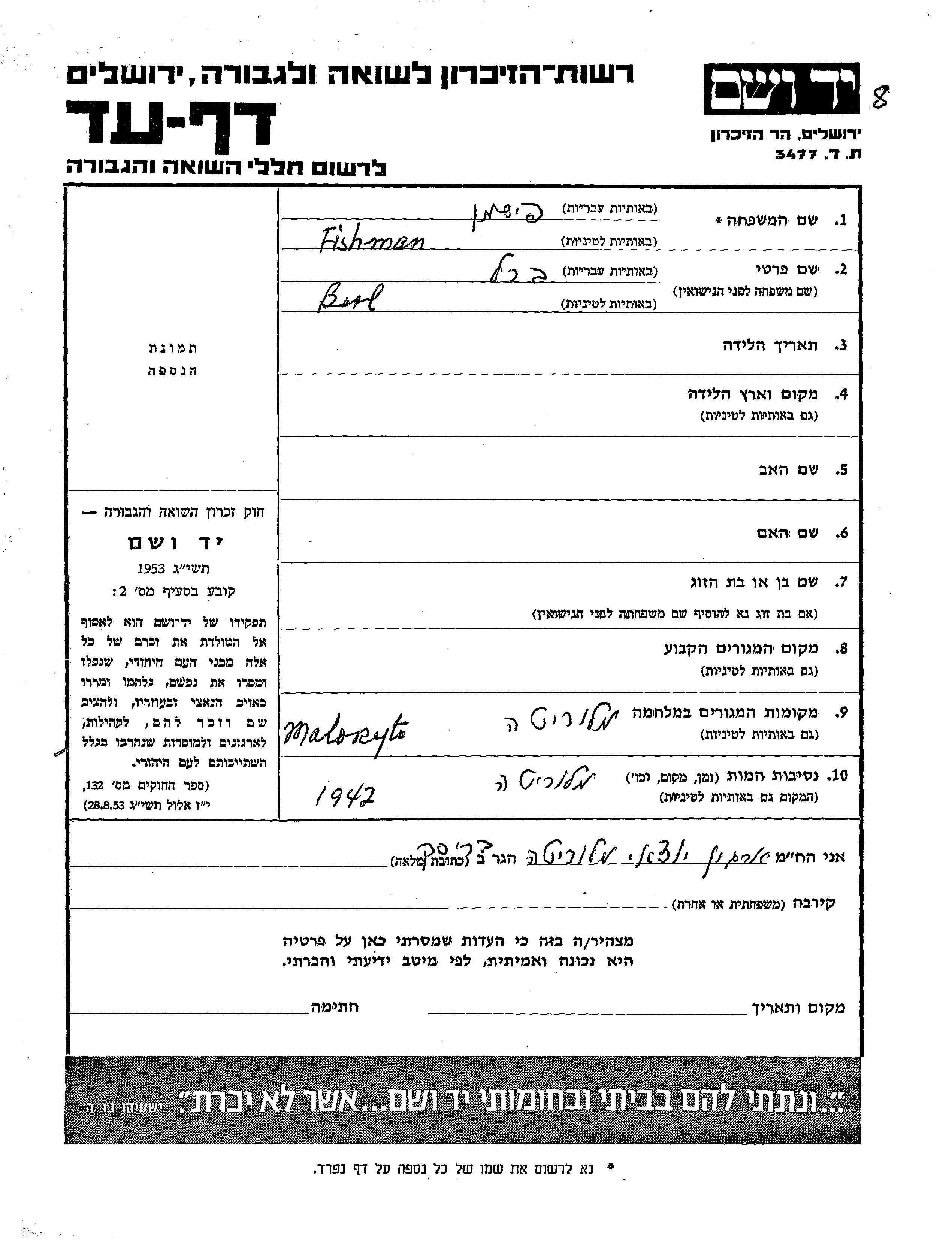 Berl Fishman. During the war he was in Maloryta, Poland.