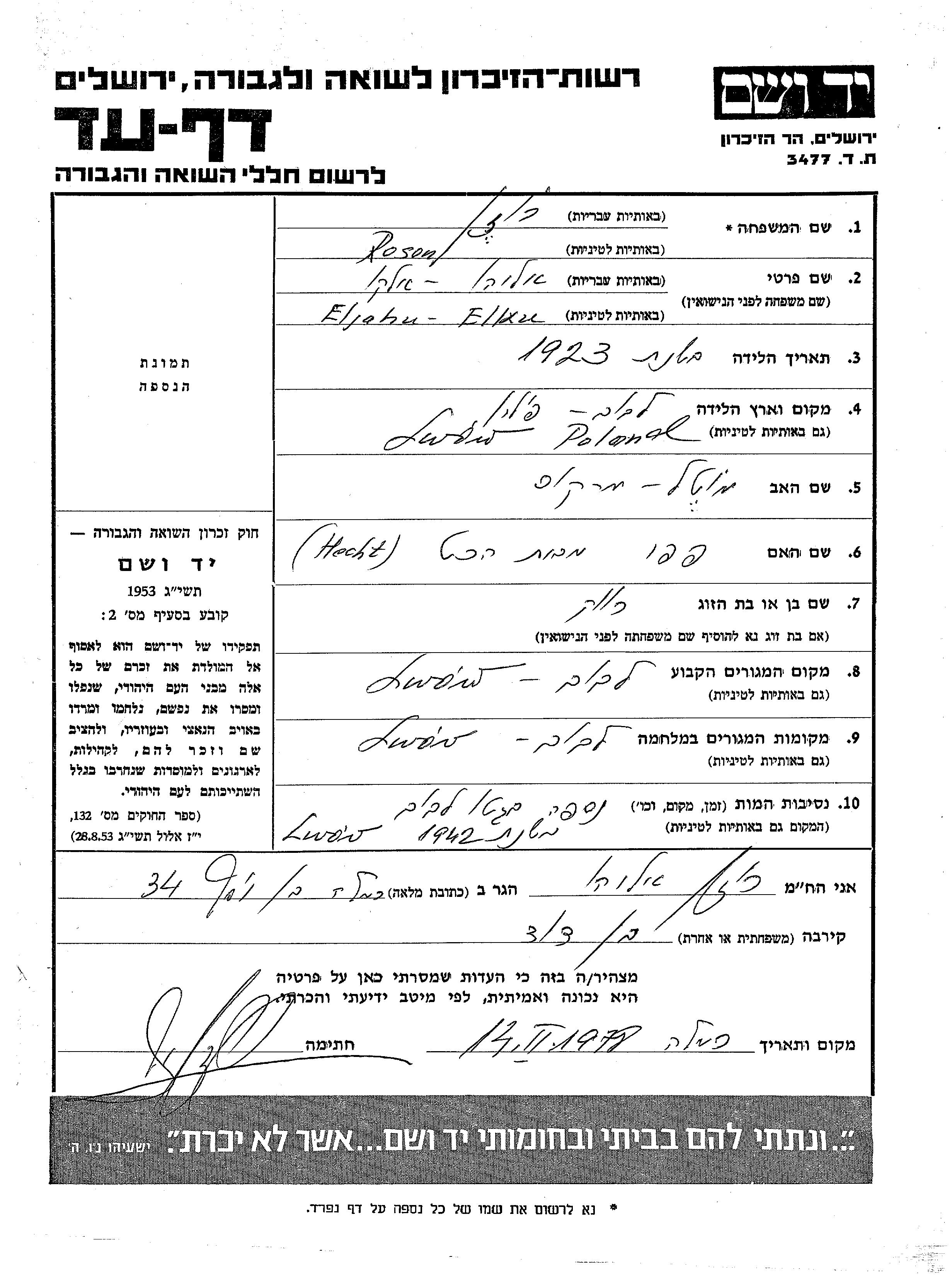 Eljahu Elko Rosen was born in Lwow, Poland, 1923 to Motel Markus and Pepi. He was single. Prior to WWII he lived in Lwow, Poland. During the war he was in Lwow, Poland. Eljahu Elko was murdered in the Shoah. Place of death: Lwow, Poland, 1942.