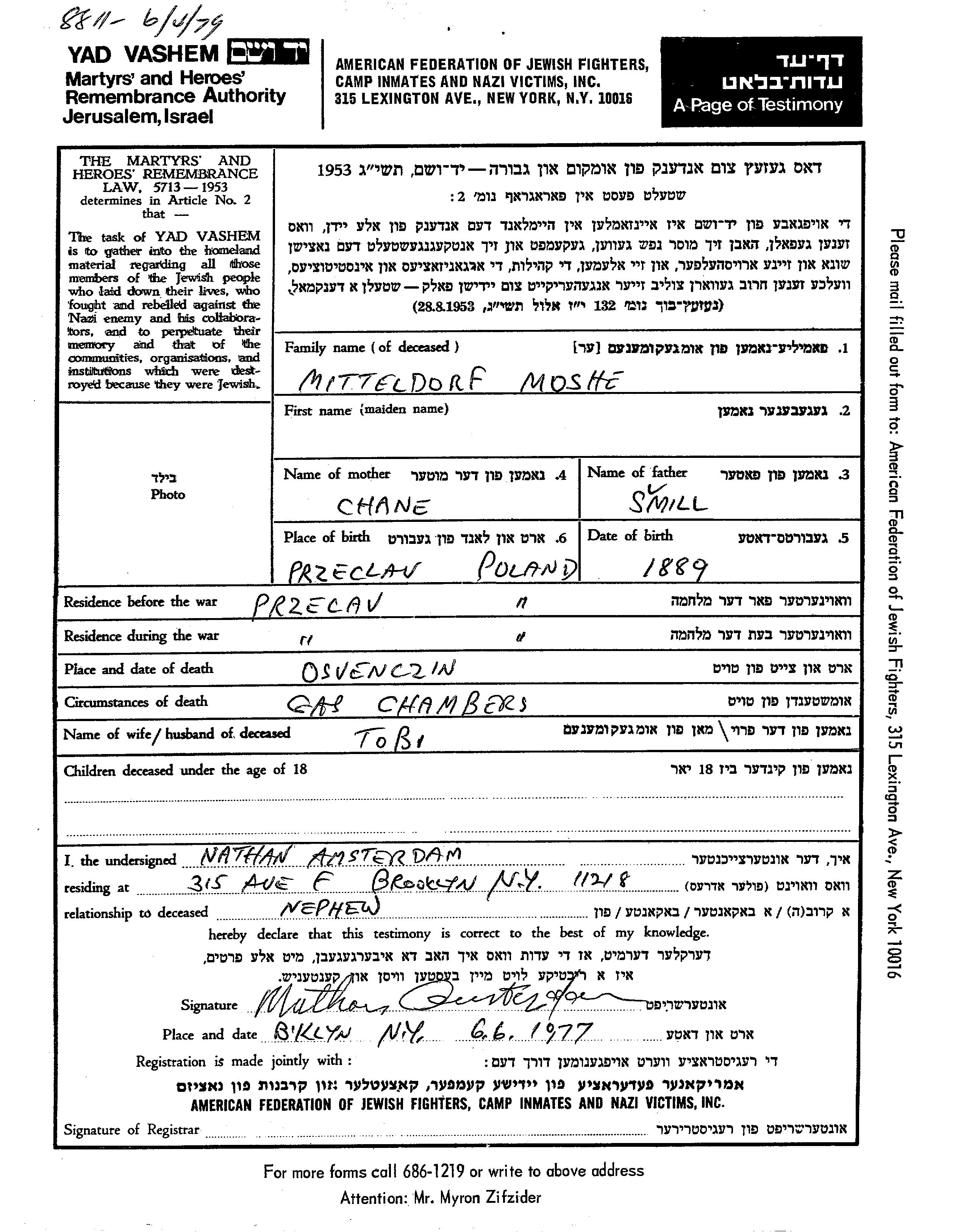 Moshe Mitteldorf was born in Przeclaw, Poland, 1889 to Smill and Chane. He was married to Tobi. Prior to WWII he lived in Przeclaw, Poland. During the war he was in Auschwitz, Poland. Moshe was murdered in the Shoah.