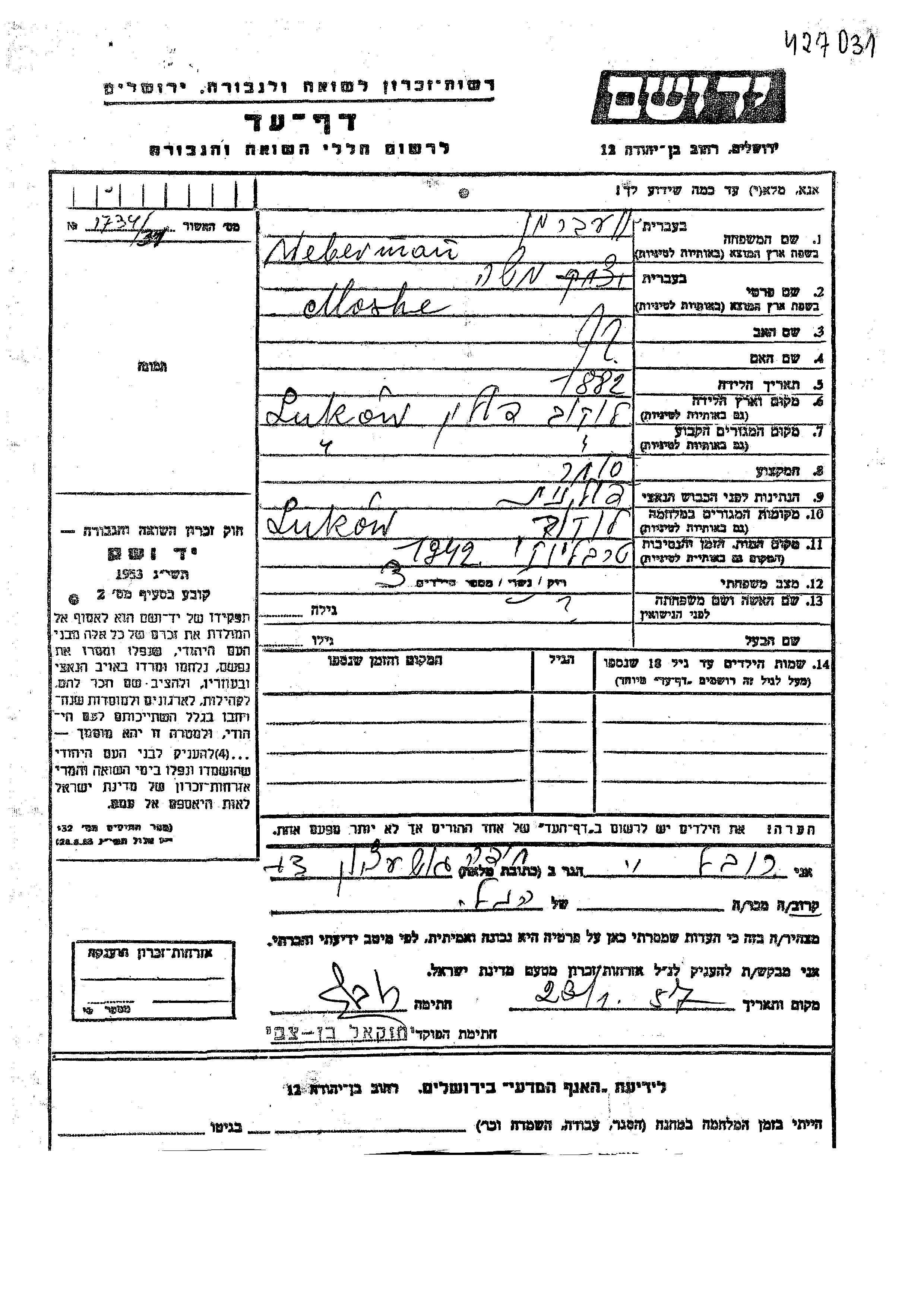 Moshe Weberman was born in Lukow, Poland, 1882. He was a merchant and married. Prior to WWII he lived in Lukow, Poland. During the war he was in Lukow, Poland. Moshe was murdered in the Shoah. Place of death: Treblinka, Poland, 1942.