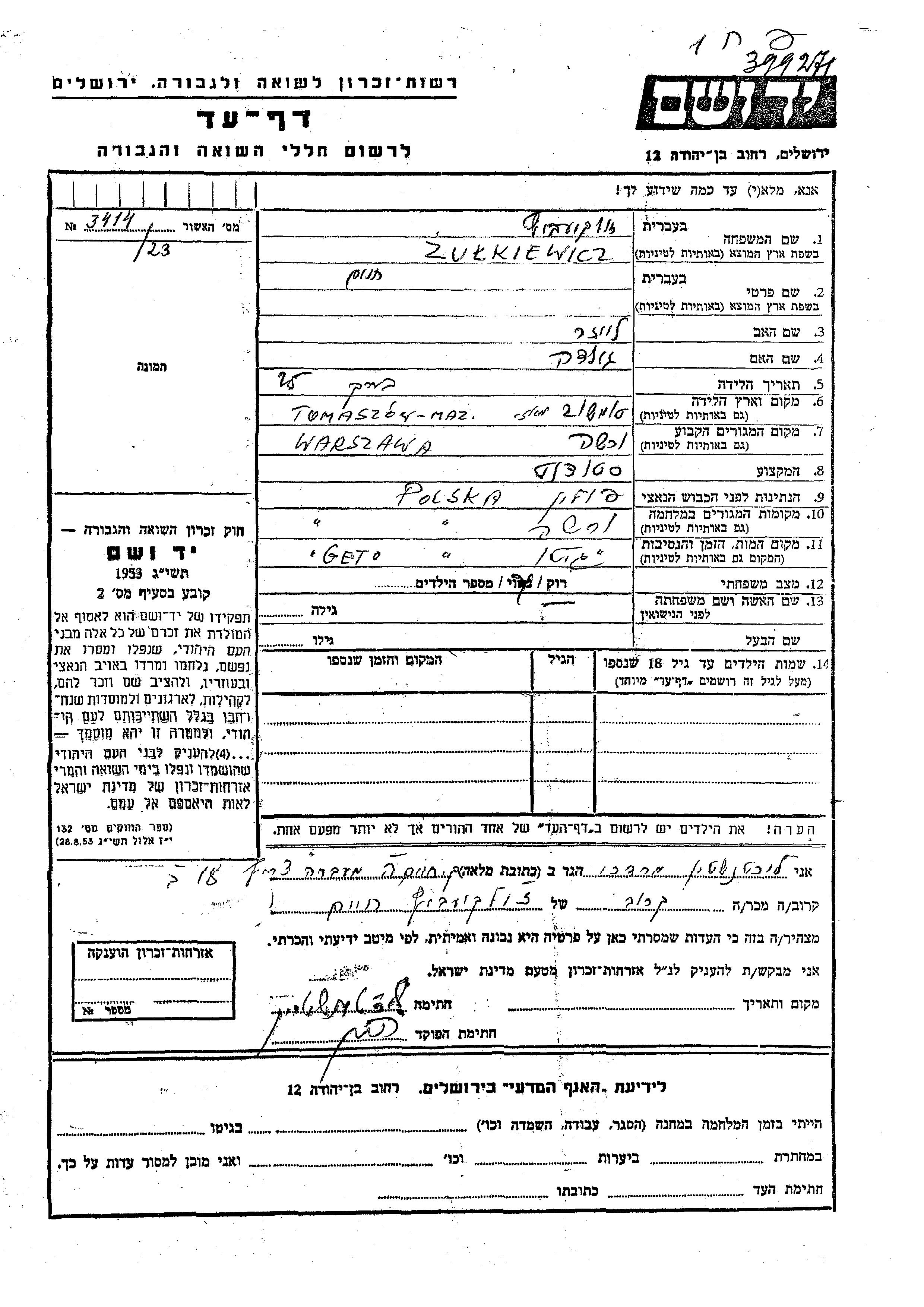 Khaim Zulkiewicz was born in Tomaszow Mazowieckie, Poland to Leizer and Golda. He was a student and single. Prior to WWII he lived in Warszawa, Poland. During the war he was in Warszawa, Poland.
